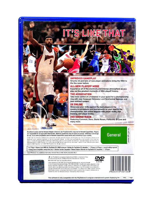 Rare Authentic New Zealand Edition with Official NZ “General” Classification embedded in the cover art – in excellent condition & 100% complete with contents: NBA 2K8 / NBA ’08 / NBA 08 / NBA 2K08 for SONY PlayStation 2 / PS2. This preowned authentic NZ Edition is in excellent condition, and complete with case, cover, manual / booklet, and game disc.