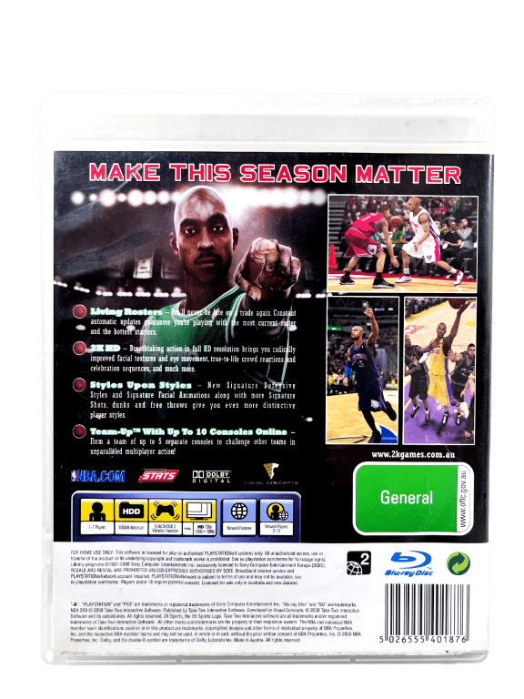 Good condition & 100% complete with contents: NBA 2K9 / NBA 2K09 / NBA 2009 for SONY PlayStation 3 / PS3. This preowned game comes complete with case + cover + manual / booklet + game disc. Price stickers have been removed from the back of the cover leaving some patches of slight yellowing where the stickers once lay, but this is purely cosmetic and not visible from the front. The manual and disc inside are each superb.