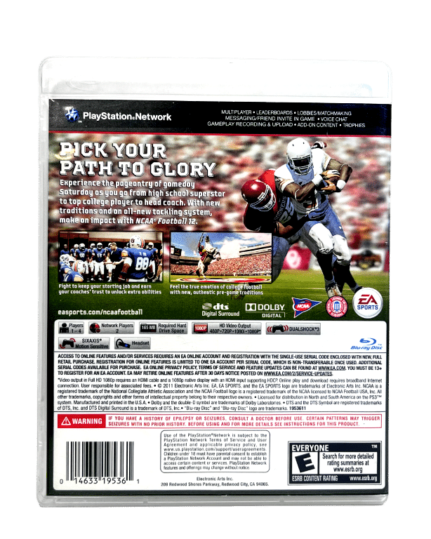 NCAA Football 12 on the PlayStation 3 takes the journey of the college athlete to the next level of depth and authenticity. Experience the pride and pageantry of gameday Saturday with all new enhanced in-game presentation, traditions and school specific crowd celebrations. Make an impact on the field as your team takes down your heated rival on the road to the National Championship.
