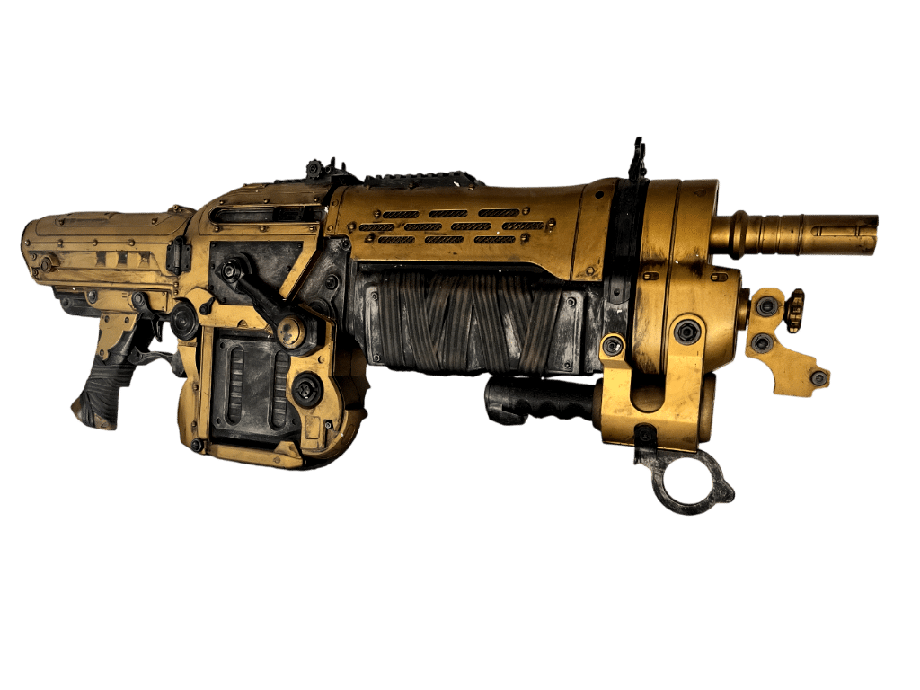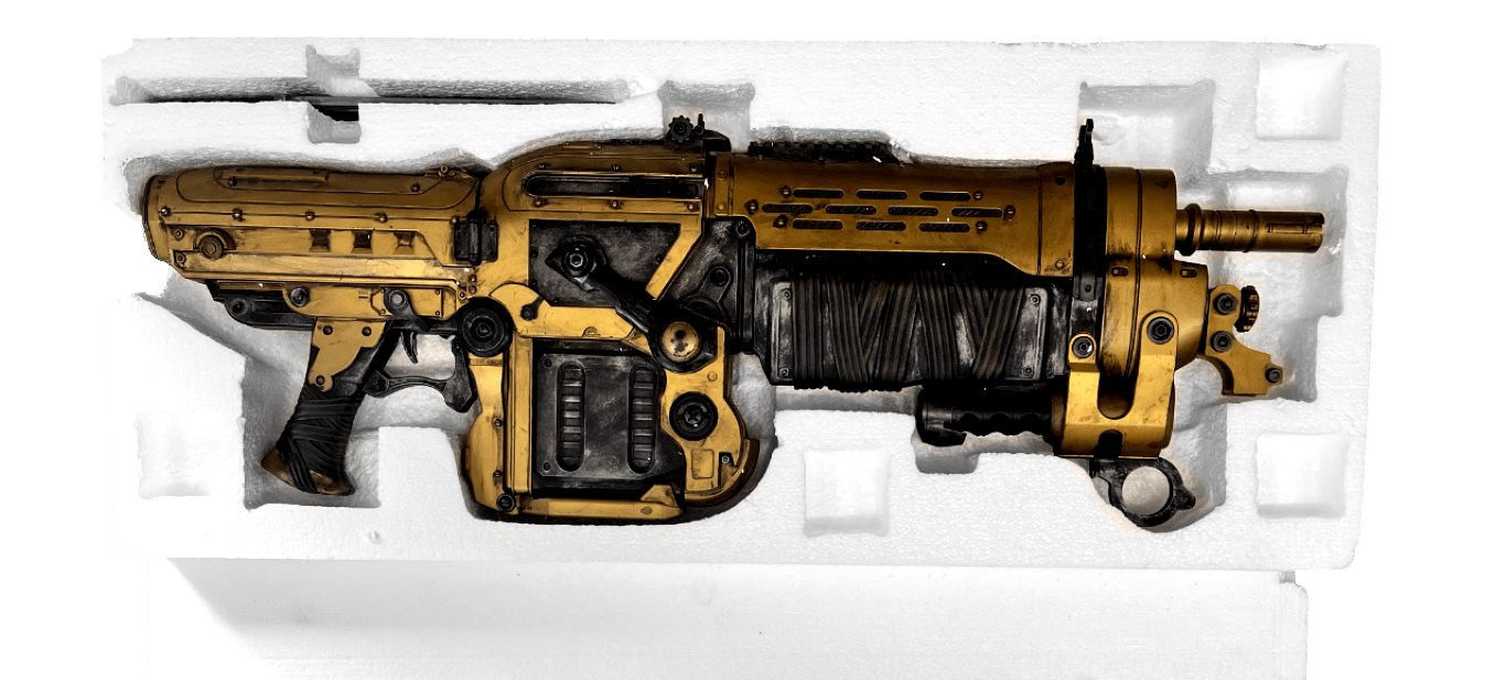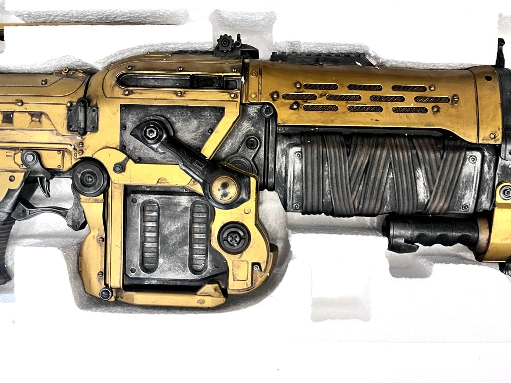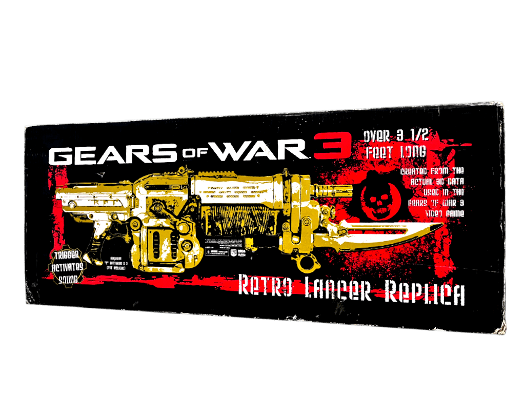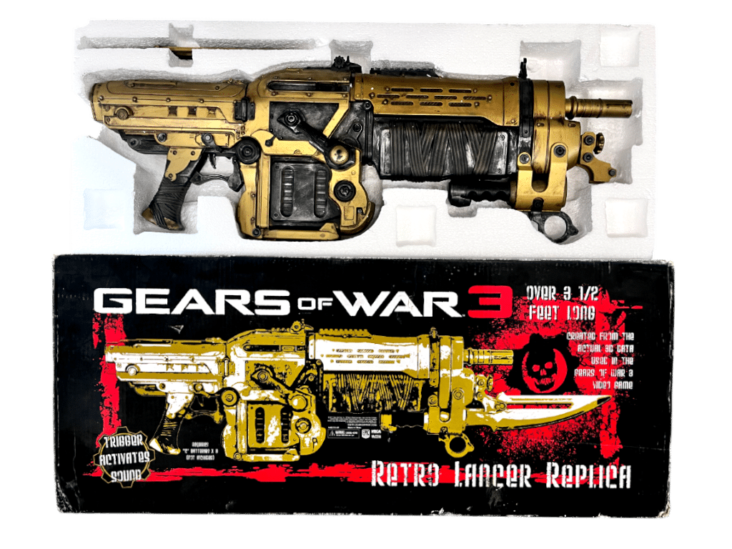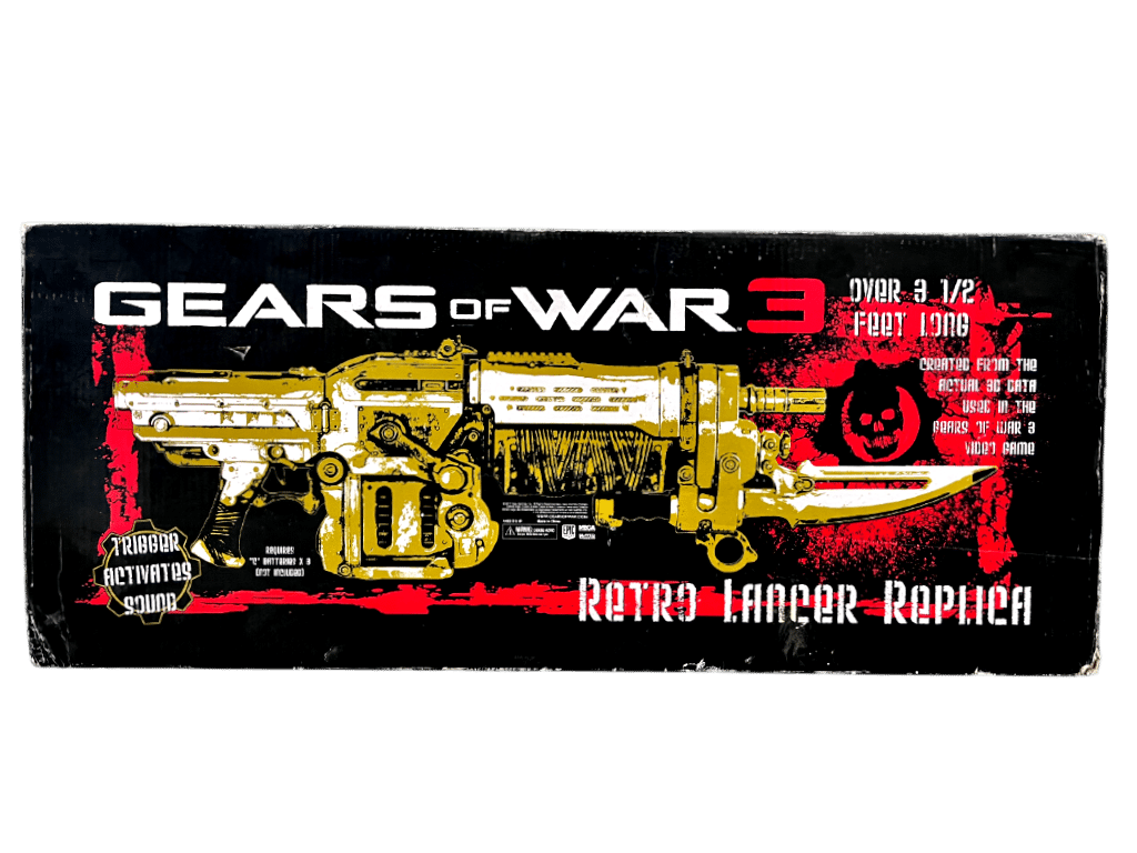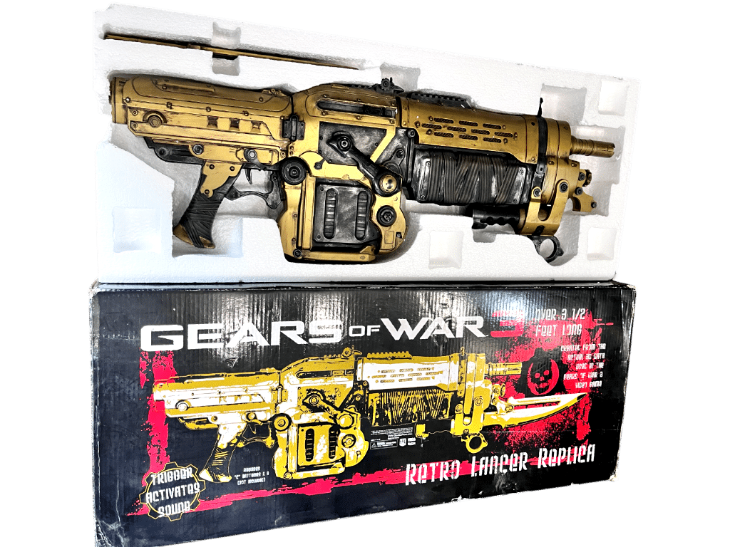 RARE Genuine NECA GOLD Gears of War 3 Retro Lancer Replica Gun – Mint in Box. This preowned LIFE SIZE collector’s weapon replica is in mint condition, and comes inside original box with inner styrofoam mount. Box has some pictured light shelf wear, but the gun itself is pristine. A very tidy (AND LARGE) collector’s item. Refer photographs.