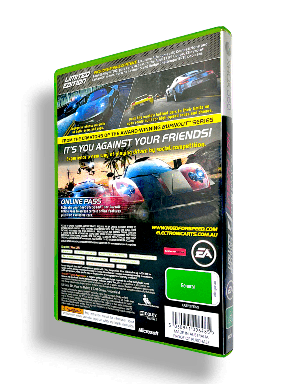 Mint condition & 100% complete with contents: Need for Speed HOT PURSUIT for for Xbox 360. This preowned game is in superb condition and comes complete with case, cover, and game disc. A very tidy and complete collector’s item, featuring a GENUINE LIMITED EDITION GAME DISC with bonus content on the disc itself.