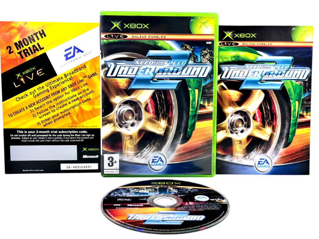 NEED FOR SPEED UNDERGROUND 2 for Original XBox. This preowned game features original case, cover, and game disc. Note that the manual is not included here. The disc has a dark patch extending from the centre circle, so this game is likely unplayable. We do not have an original Xbox console here to test the game, so please consider this an unplayable game in its current format. You are paying for a case, cover, and a faulty game disc.