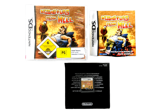 Rare Nintendo DS Game in excellent condition & 100% complete with contents: NEIGHBOURS From Hell The Video Game for NINTENDO DS. This preowned game is in superb condition – a tidy and complete collector’s item – with case, cover, manual / booklet, Nintendo booklet, and game cartridge.