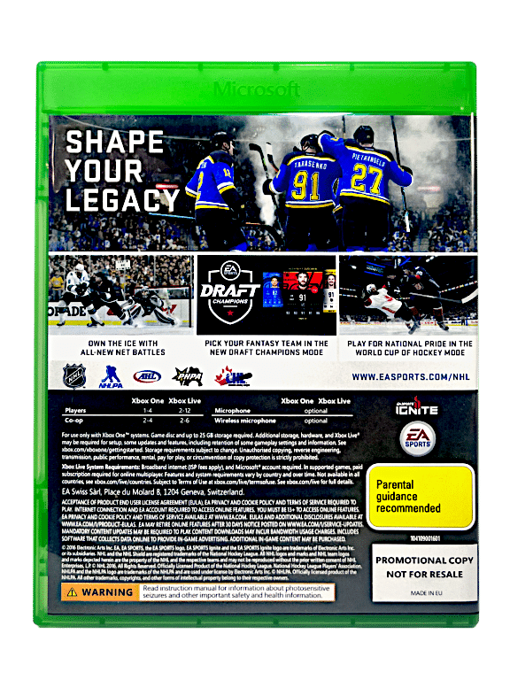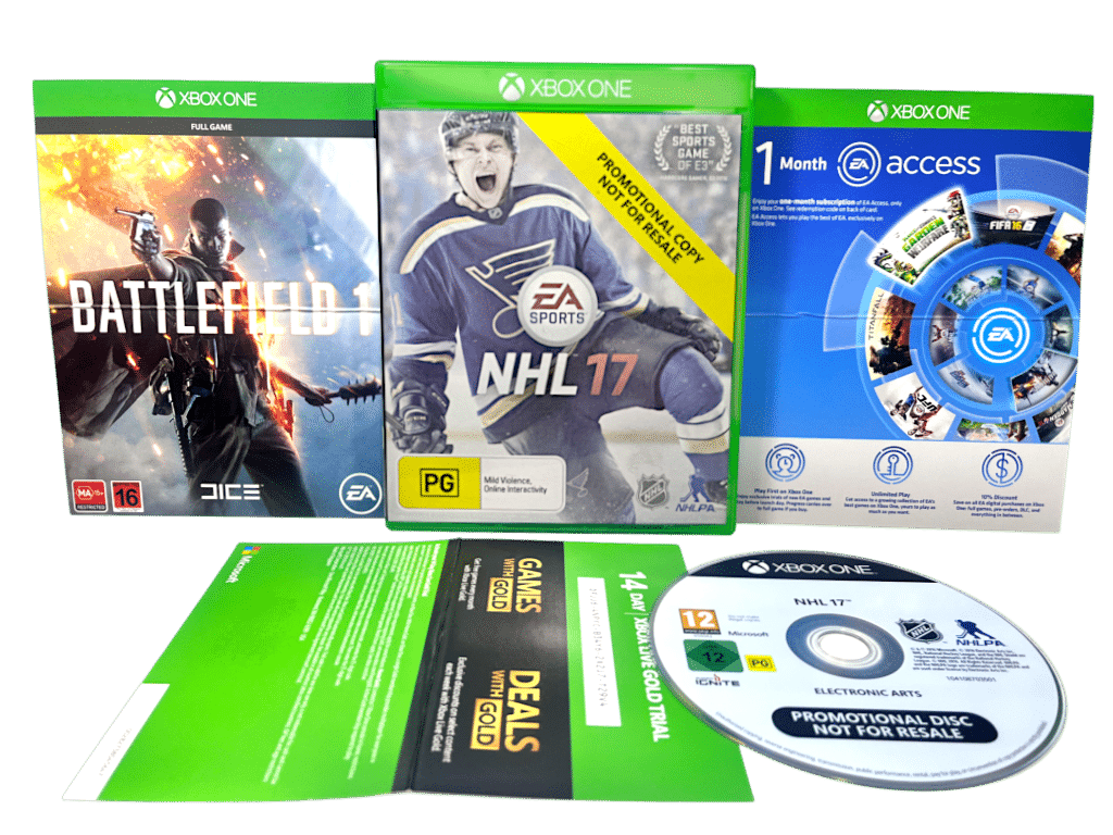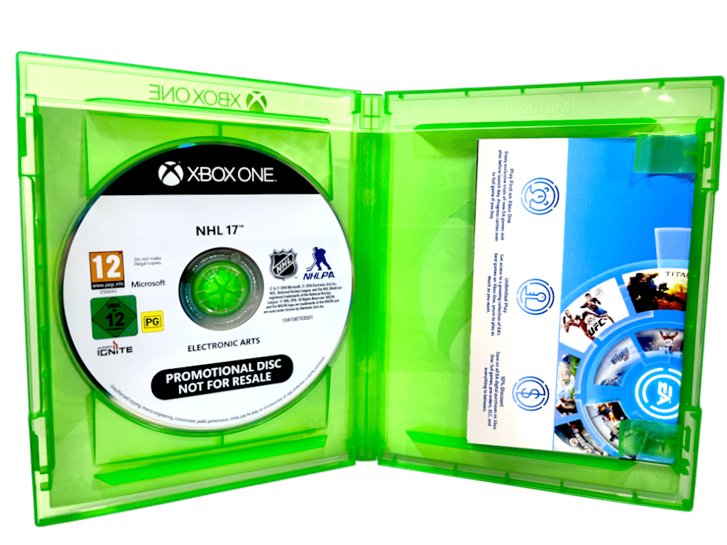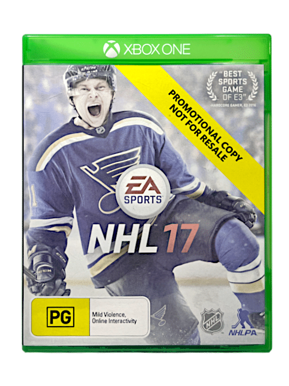 GENUINE PRE-RELEASE EDITION in mint condition: NHL 17 (Xbox One). This preowned authentic pre-release Xbox One game is in mint condition and comes complete with case + cover + game disc. Carries an authentic pre-release “PROMOTIONAL COPY ONLY” and “NOT TO BE SOLD SEPARATELY” embedded in the cover art both front and back. Also included are three Xbox One promo cards folded neatly inside the case. Refer images.