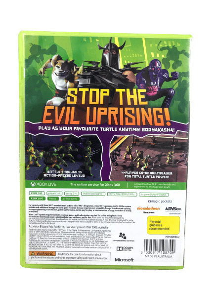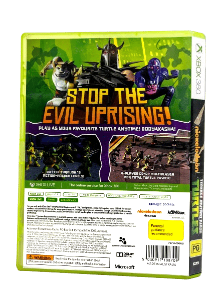 RARE & Collectible XBox 360 Game in Excellent Condition & 100% Complete with Contents: Teenage Mutant Ninja Turtles / Nickelodeon TMNT for XBox 360. This preowned game is in superb condition and comes complete with case, cover, and game disc (no manual was printed for this game, but instructions are readily available online, and the game is self-explanatory).