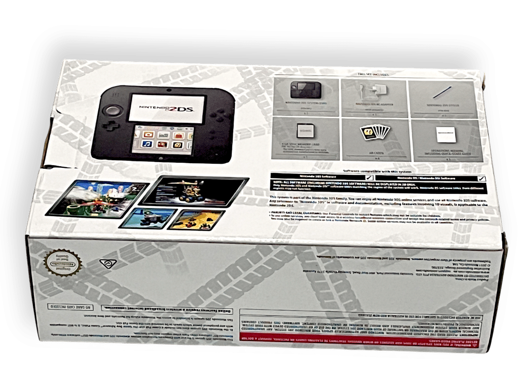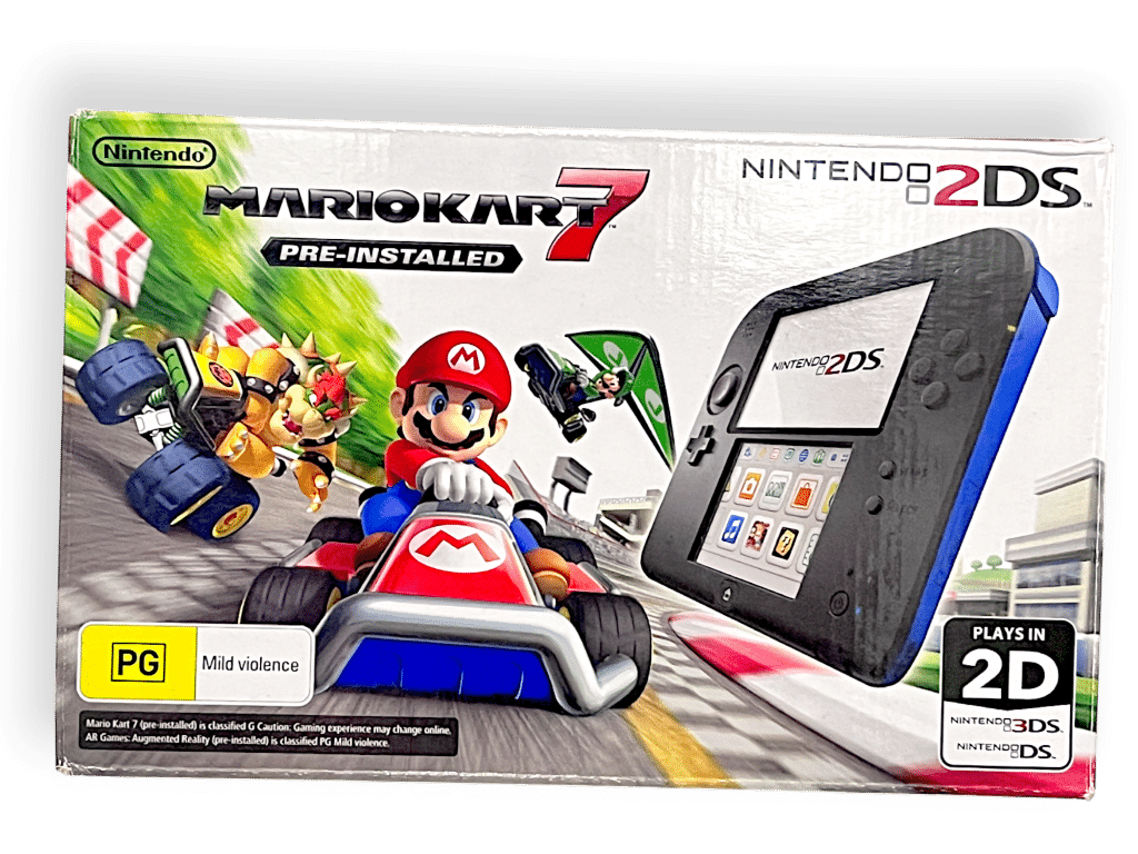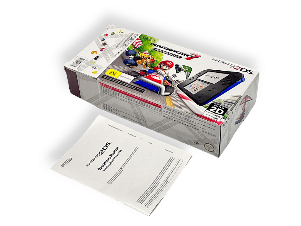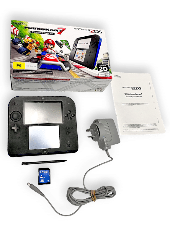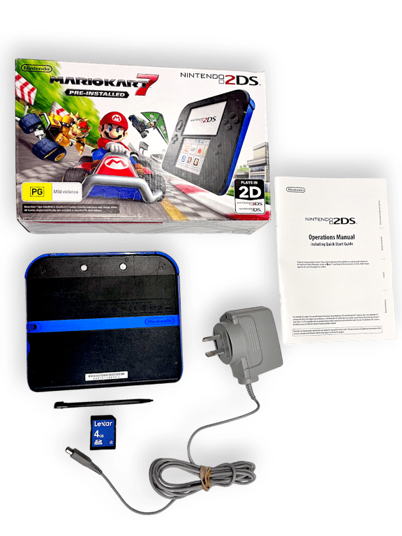 Nintendo 2DS Console *BOXED* with Genuine Charger + SD Card. This pre-owned Nintendo 2DS console includes pictured box instruction manual and authentic Nintendo 3DS wall charger.