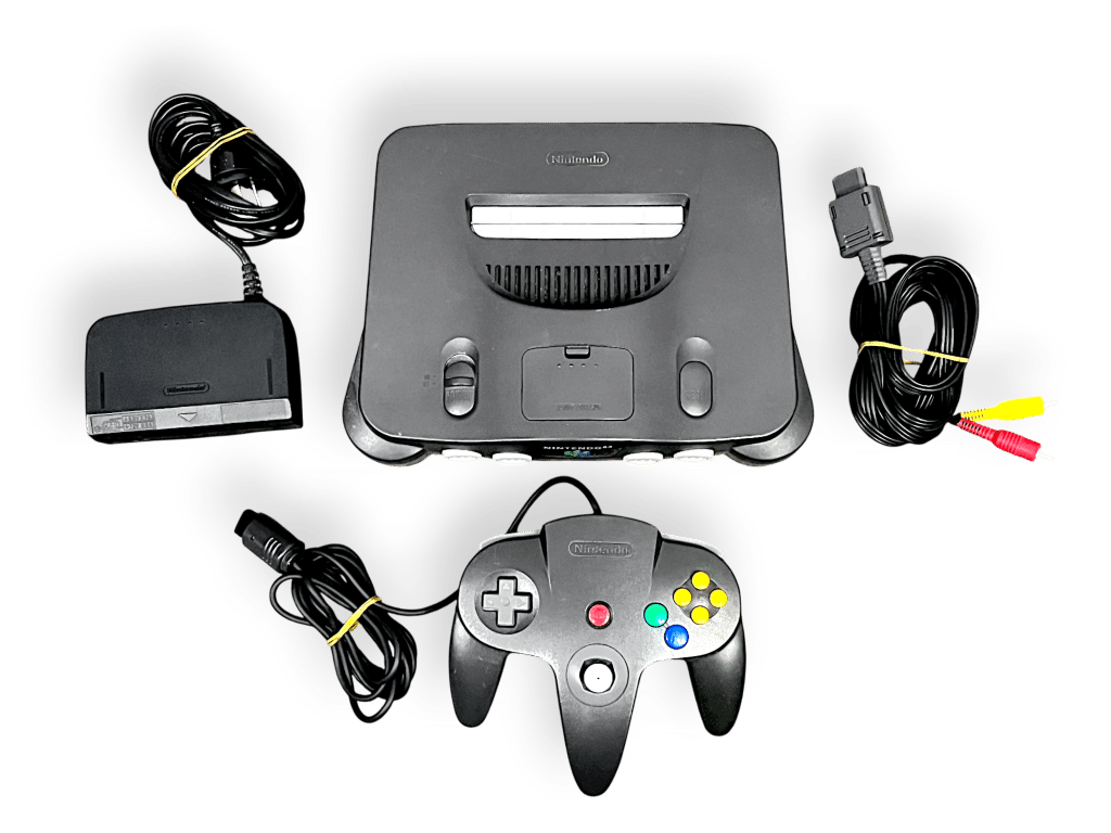 Nintendo 64 Console Bundle (Charcoal Grey). This pre-owned N64 console bundle is in good condition and perfect working order. Refer photographs. Includes all necessary components: the console, a genuine Nintendo 64 controller, a genuine Nintendo 64 power supply, and AVI cables.