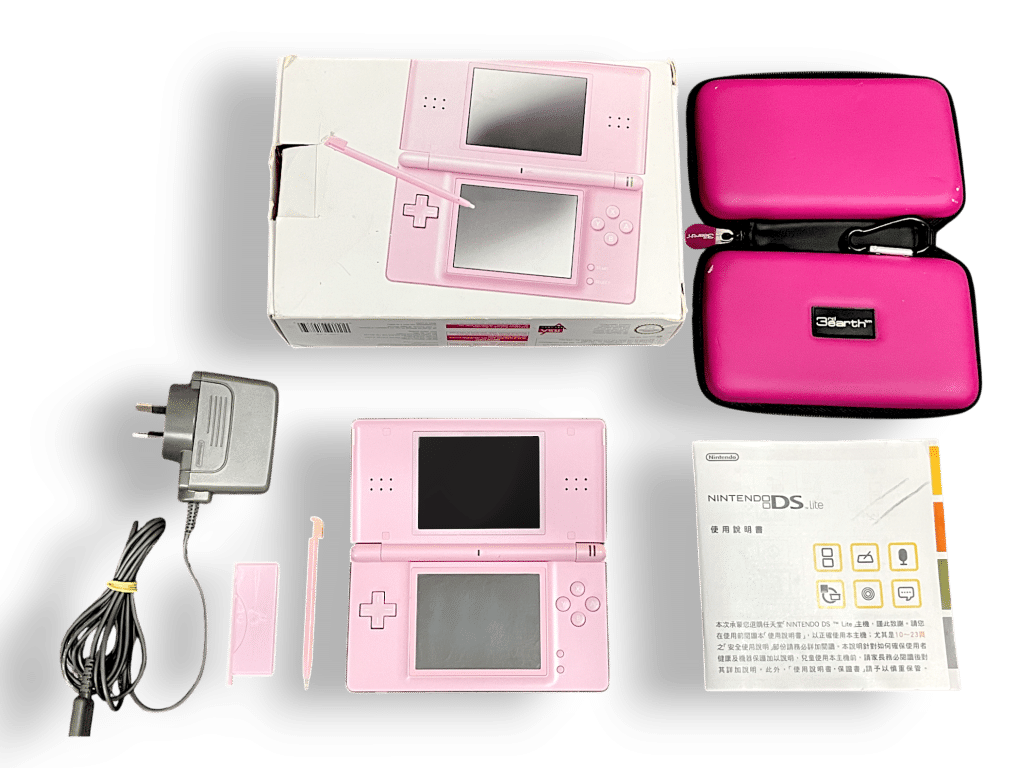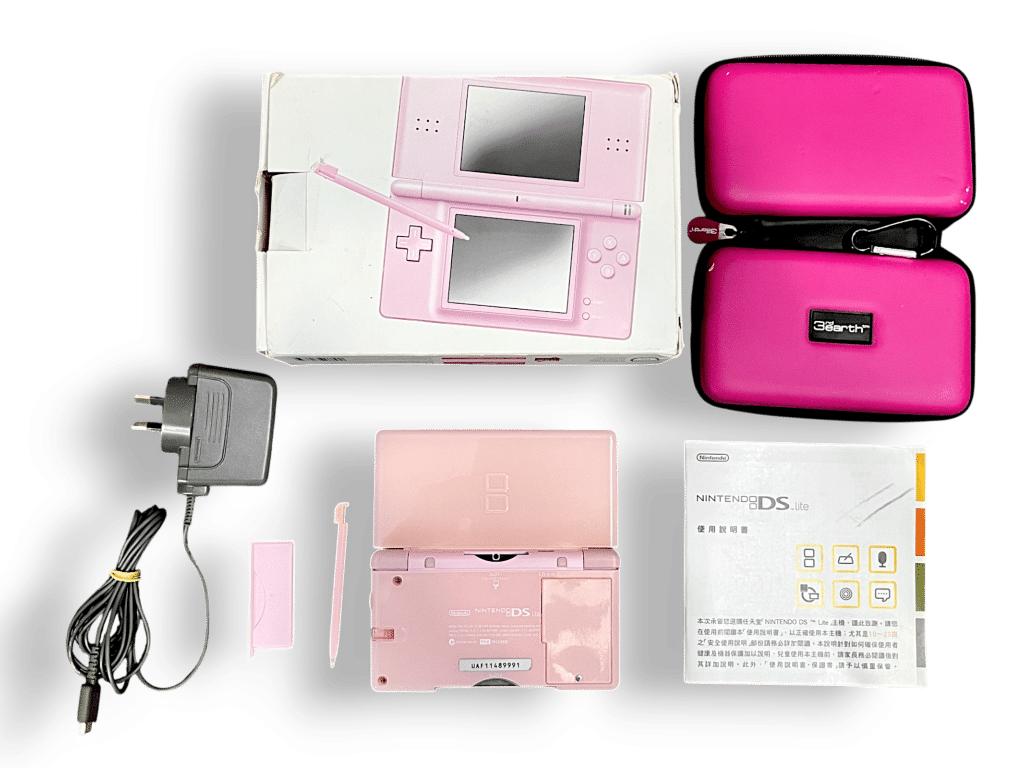 Nintendo DS Lite Console PINK CONSOLE + BOX + CASE + GENUINE CHARGER + STYLUS + GBA GUARD + INSTRUCTION BOOKLET + BOX. This preowned genuine Nintendo console is in good condition and perfect working order. Includes matching Pink Stylus Pen + Pink Game Boy Advance Plastic Guard + GENUINE NINTENDO DS Lite USB Charger + Black Zip Travel Case.