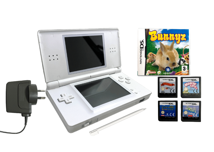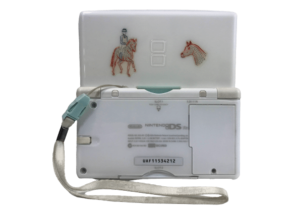 NINTENDO DS Lite Polar White Console bundle with FIVE Games & Genuine Nintendo Charger. This preowned Nintendo DS Lite is in very good condition and perfect working order, and has some trendy stickers on the back of the console and a safety strap attached. This console also includes a Genuine Nintendo DS Lite AC Waller Charger, Stylus Pen, and FIVE (5) Nintendo DS Game cartridges: Imagine Bunnyz (with case and manual), Riding Star, My Horse and Me 2, Horse Life 2, and Horsez the game. This preowned Nintendo DS Lite is in very good condition as pictured, with light superficial imperfections, and these cosmetic only. Refer photographs.