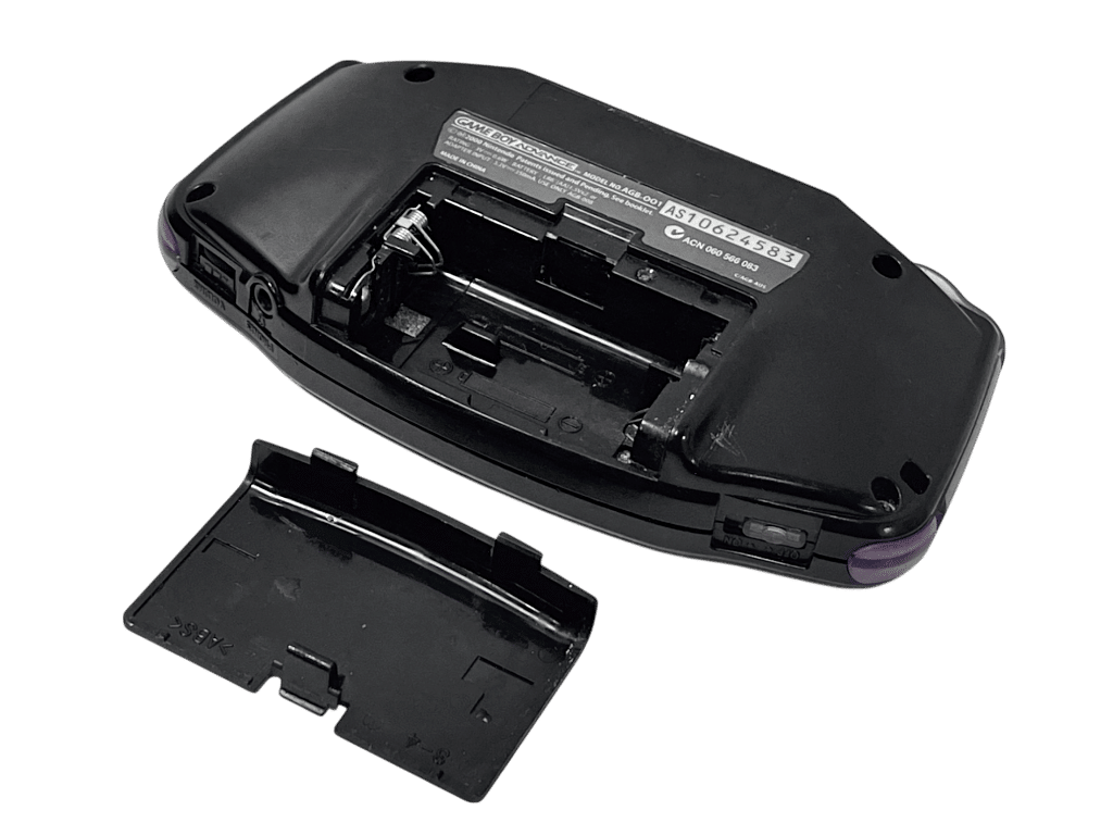 Nintendo Gameboy Advance console BLACK with PURPLE buttons. This preowned console is in good condition with mild cosmetic imperfections, but is in excellent working order and reading games better than most. It takes 2 x AA batteries (batteries sold separately). It includes battery hatch pictured. A reliable GBA Console with only cosmetic imperfections (light surface markings and scratches) that will not let you down.