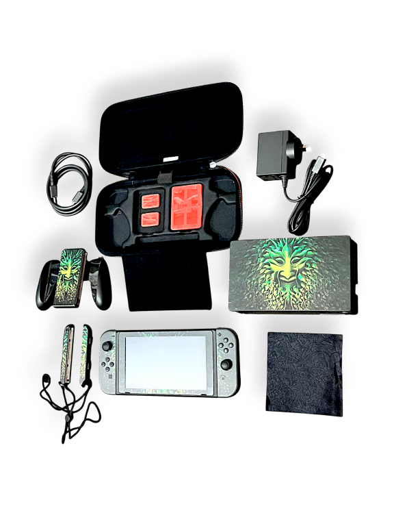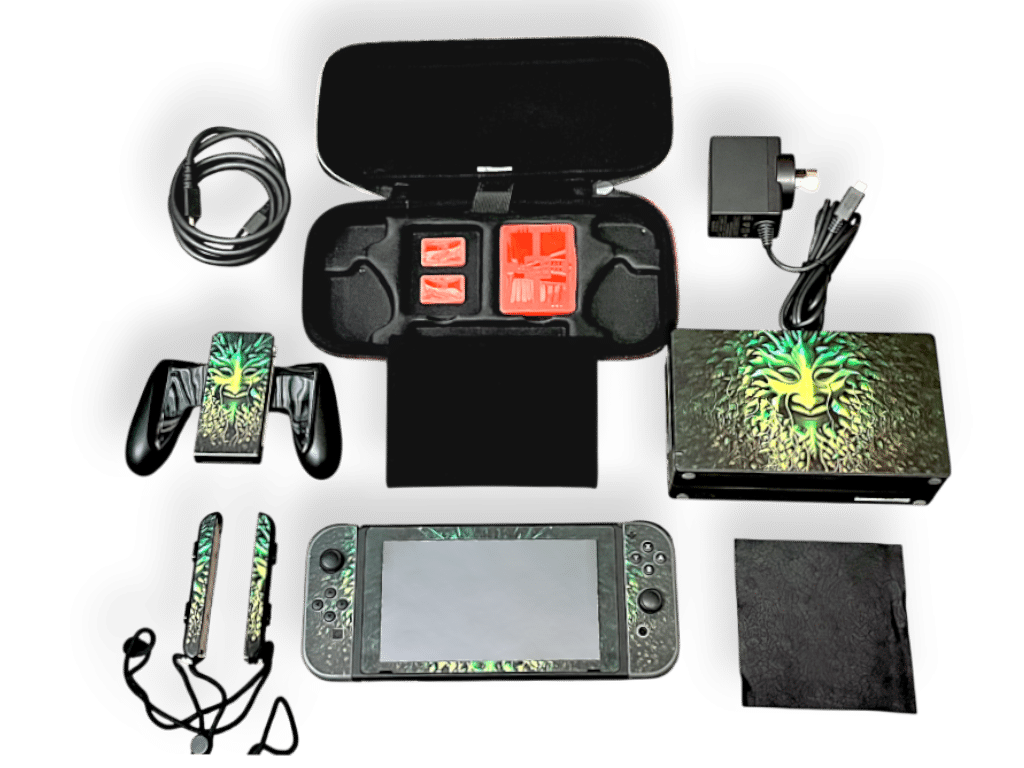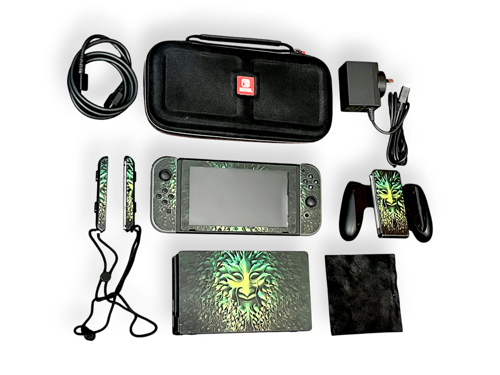 FOR SALE: Nintendo Switch console in good condition and perfect working order. This preowned Nintendo Switch console includes Official Nintendo Switch Dock (Docking Station) + 2 x Nintendo Switch Joy-Cons + Nintendo AC Wall Charger + HDMI Lead + 2 x Nintendo Joy-Con Guards (Straps) + quality Zip Switch Console Case + Miniature Red Plastic Nintendo Switch Game Cartridge Case pictured. All items in tidy condition as pictured, with minor preowned using marks consistent with use. Features custom stickers pictured.