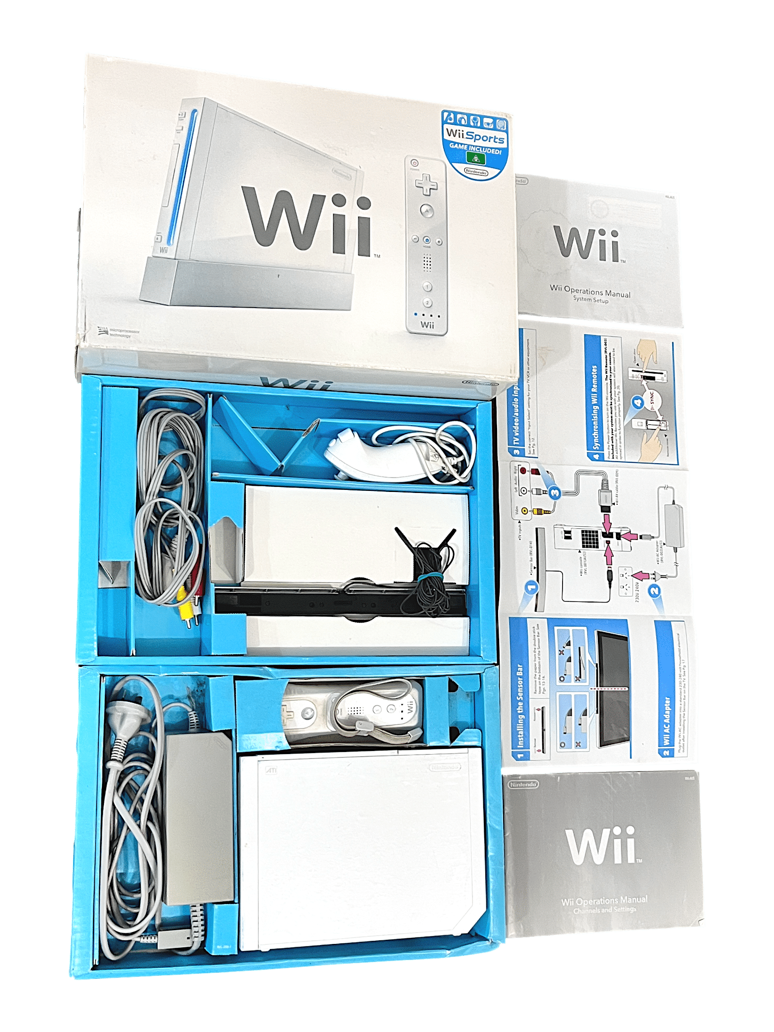 BOXED COMPLETE Wii Playing Bundle: Nintendo Wii Console + Nintendo Wii AC Power Adapter + Nintendo Wii AVI Leads + Wii Sensor Bar + Wii Console Stand inside Original Box. This preowned authentic Nintendo Wii console is in good condition and perfect working order, with superficial markings and cosmetic imperfections only which do not hinder functionality in any way.