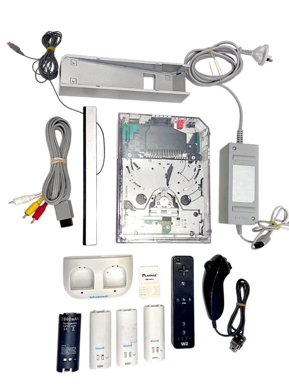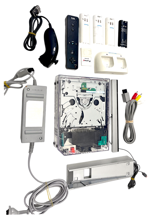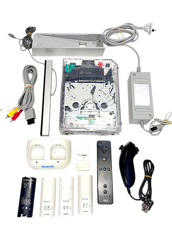 RARE SEE-THROUGH NINTENDO Wii Console! This preowned CLEAR TRANSLUCENT Nintendo Wii Console is in excellent condition and perfect working order, and includes a GENUINE Nintendo Black Wii Remote + Genuine Nintendo Black Nunchuk + AC Power Adapter + AVI Leads + Sensor Bar + Console Stand + PlayMax Wii Memory Card!. This preowned Nintendo Wii Black Console Bundle is in good condition, and includes Nintendo Wii AVI Leads to connect to your TV, Wii Sensor Bar, Nintendo Wii AC Power Adapter, Wii Remote (Black) + Black Nunchuk + Wii Console Stand + Wii Memory Card which appears to be for GameCube (this console is also Nintendo GameCube compatible, with the side ports for GameCube controller and memory card! Also included is a bonus Rechargeable battery station with three included rechargeable batteries. A complete playing bundle, ready for its new owner. Refer photographs.