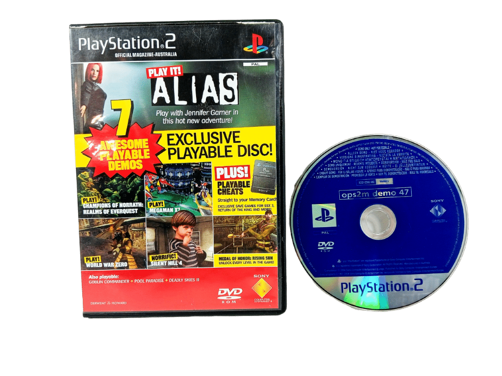 Official PlayStation 2 Demo Disc + Box ops2m Demo 47. Preowned. Features Alias etc. This preowned game is in good condition and comes with pictured contents. Disc may have light markings and superficial scratches, but these are purely cosmetic and do not hinder performance or gameplay in the slightest. This item comes with a 30 Day Warranty.