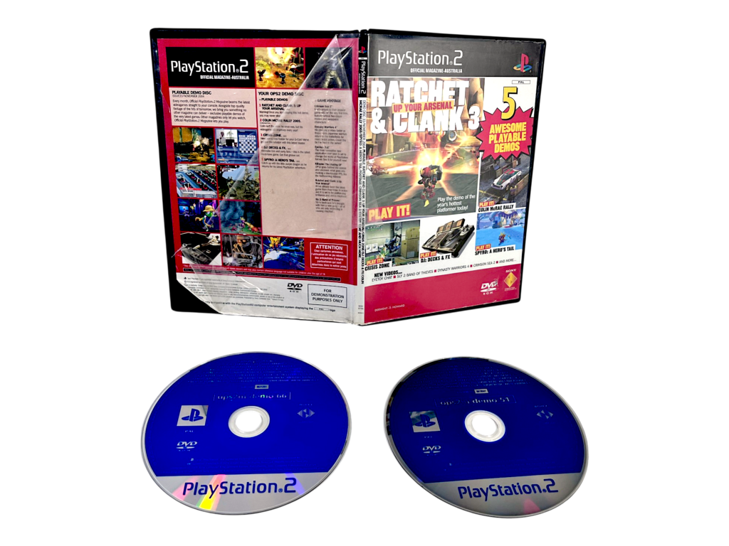 DESCRIPTION: This two‑disc demo set from the Official PlayStation Magazine includes a case and both demo DVDs, offering a nostalgic snapshot of mid‑2000s PlayStation culture. The playable demos feature titles such as Ratchet & Clank 3, FlatOut, Colin McRae Rally 2005, and Desert Rats vs. Afrika Korps, while the video footage showcases upcoming releases and behind‑the‑scenes content. These discs were used to preview new games before release, making them historically significant for collectors. With promotional artwork and era‑specific branding, this set is a unique addition to any PS2 collection focused on gaming history.