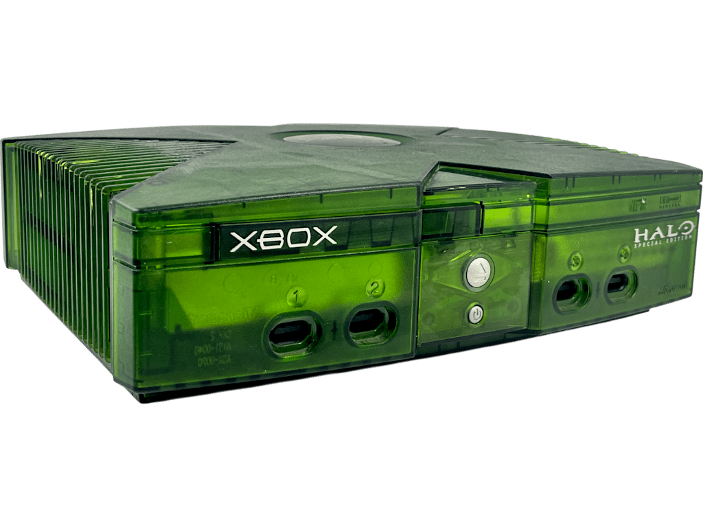 MODDED (RUNNING XBMC – REFER SLIDESHOW) LIMITED EDITION HALO Xbox Console (TRANSLUCENT GREEN) in good condition and perfect working order. This authentic Halo Original XBox Console includes an authentic Microsoft XBox Controller (Black) + Power Lead + XBox AVI Lead to connect the console to your TV. This console is MODDED.