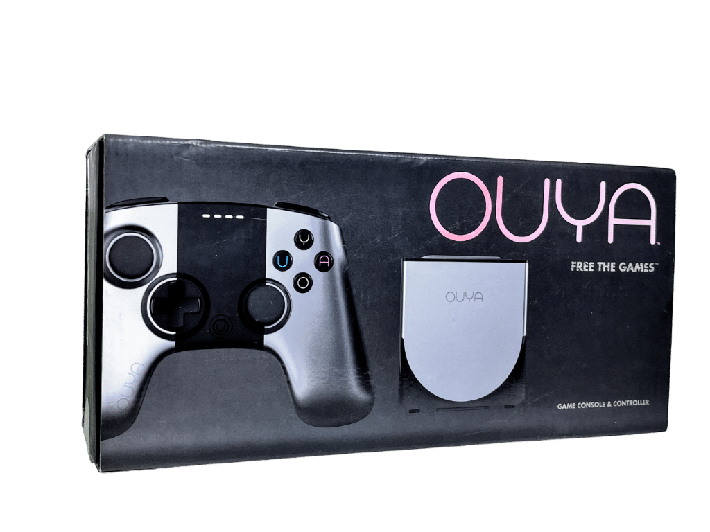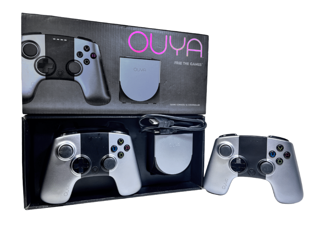 OUYA Game Console and TWO (2) x Official OUYA Controllers. Silver (OUYA1) 1GB RAM 8GB Storage – Mint in Box. Preowned, but light use and in excellent condition as pictured.