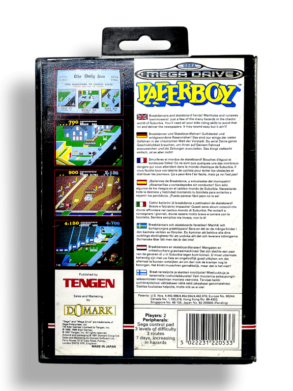 Paperboy delivers arcade-style fun to the Mega Drive with the role of a suburban paper carrier. Players must throw newspapers into mailboxes and doorsteps while avoiding cars, dogs, break dancers, and other hazards. Both comical and challenging, it’s a test of timing and precision wrapped in quirky suburban chaos.