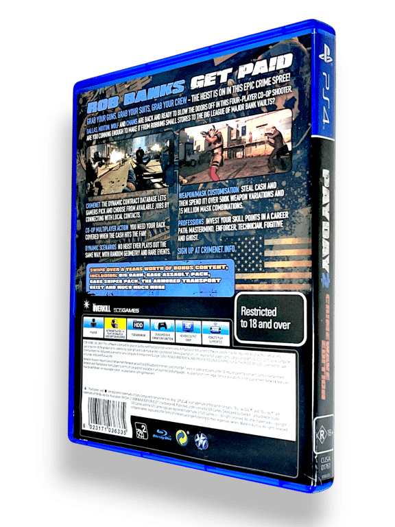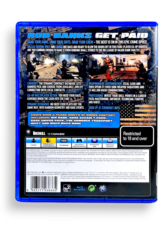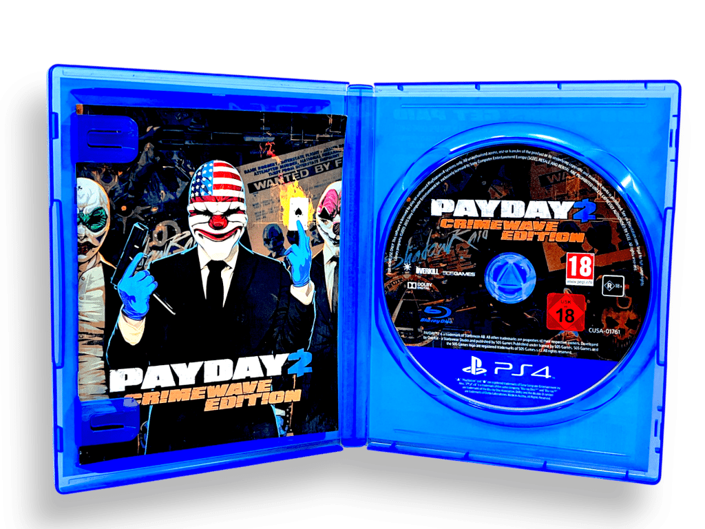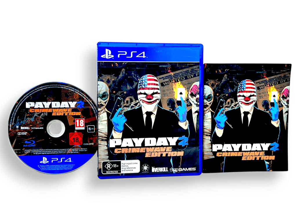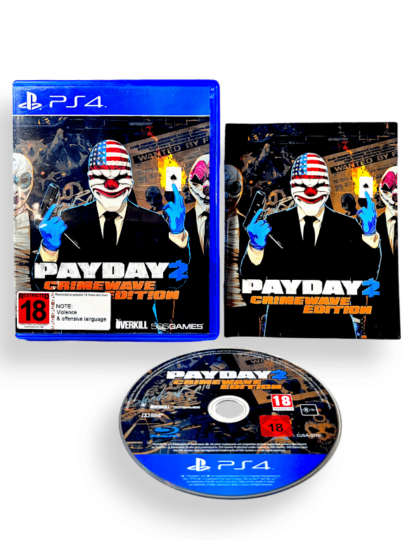 Payday 2: Crimewave Edition / Pay Day 2 Crimewave Edition for SONY PlayStation 4 / PS4. This preowned game is in excellent condition and comes complete with case, cover, manual / booklet, and Genuine “CRIMEWAVE EDITION” PayDay 2 Game Disc with FULL GAME + ALL CRIMEWAVE EDITION ADDITIONAL CONTENT on disc.