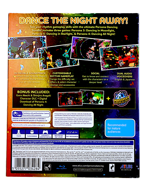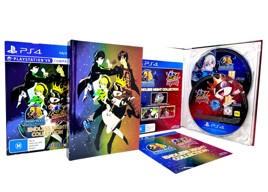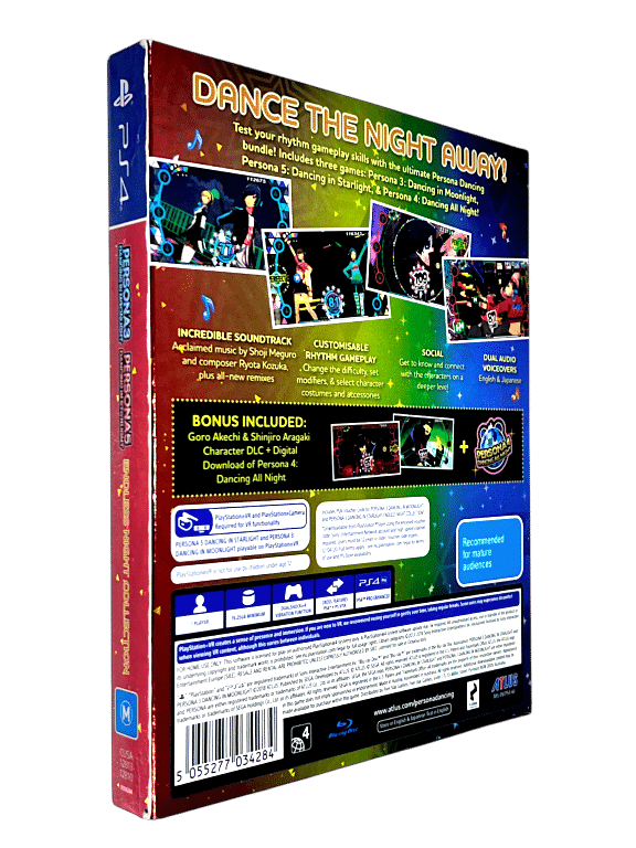 3 games in 1! Jam out to all your favorite Persona music with both Persona 3: Dancing in Moonlight and Persona 5: Dancing in Starlight in an exclusive collector’s box featuring character art by Shigenori Soejima. Also includes a digital download code for Persona 4: Dancing All Night for the PlayStation 4 – the only way to get P4D on PS4!