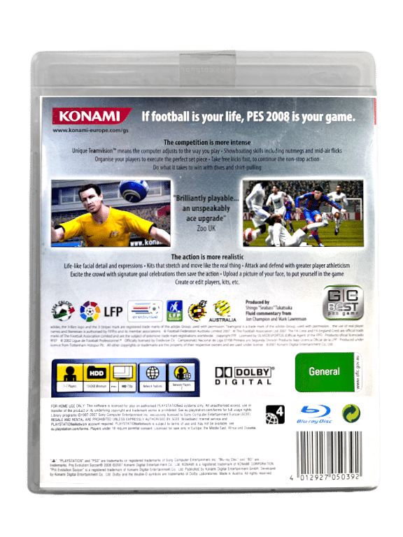 PES PRO EVOLUTION SOCCER 2008 for SONY PlayStation 3 / PS3. This preowned game is in superb condition and comes complete with case + cover + manual / booklet + game disc. Light laminiate wear to case, but this is purely cosmetic. A price sticker has been removed from the back of the cover leaving a tiny patch of yellowing where the sticker once lay, but this is purely cosmetic and not visible from the front, and each of the internal contents are fantastic.