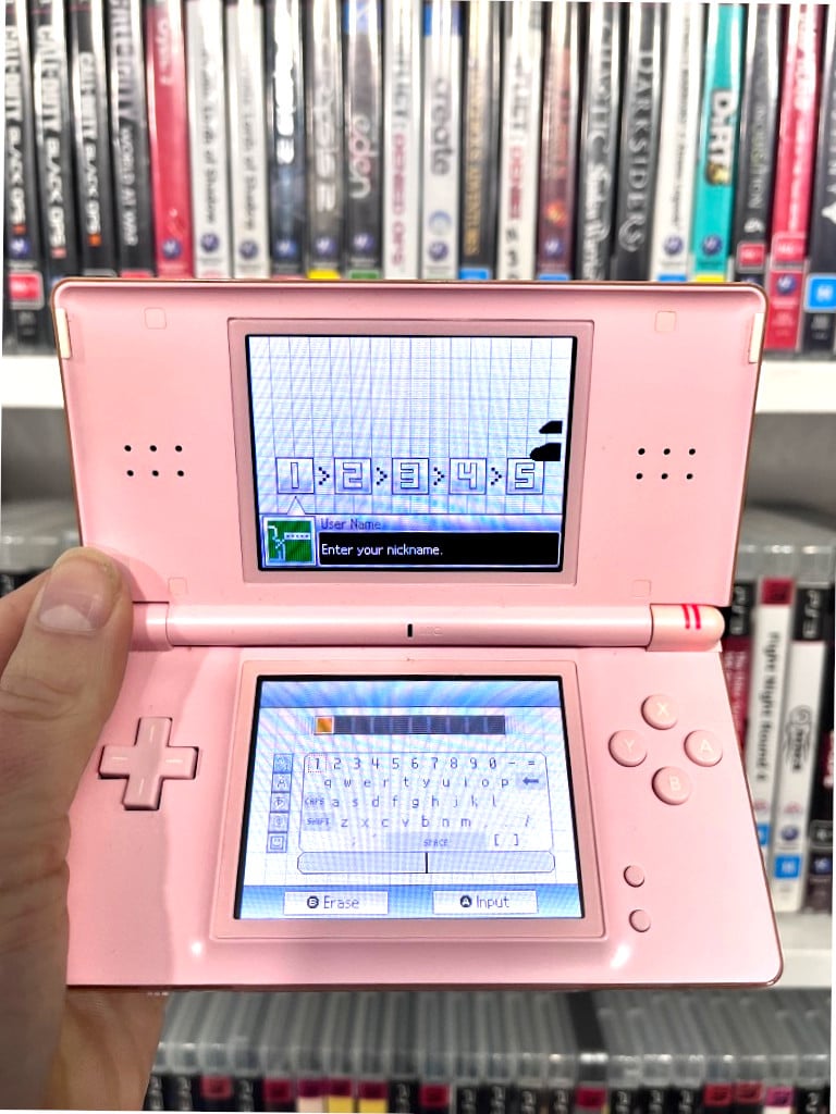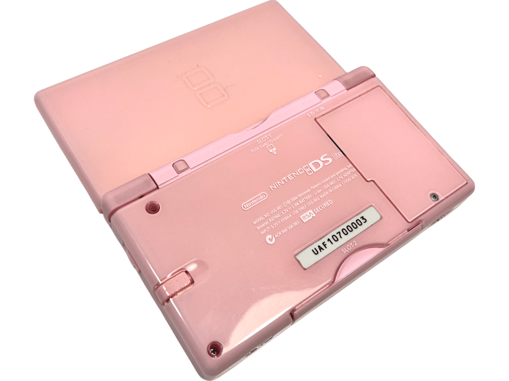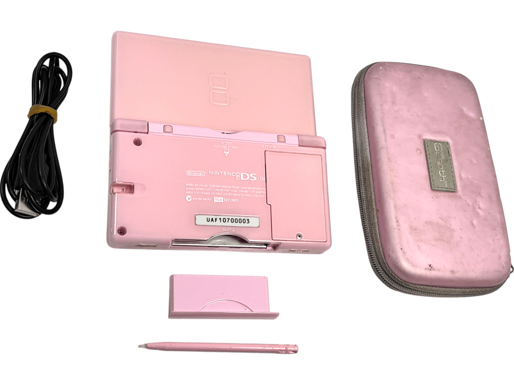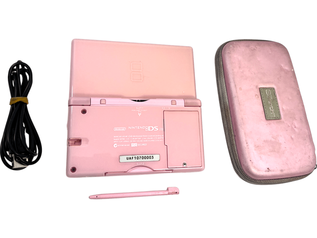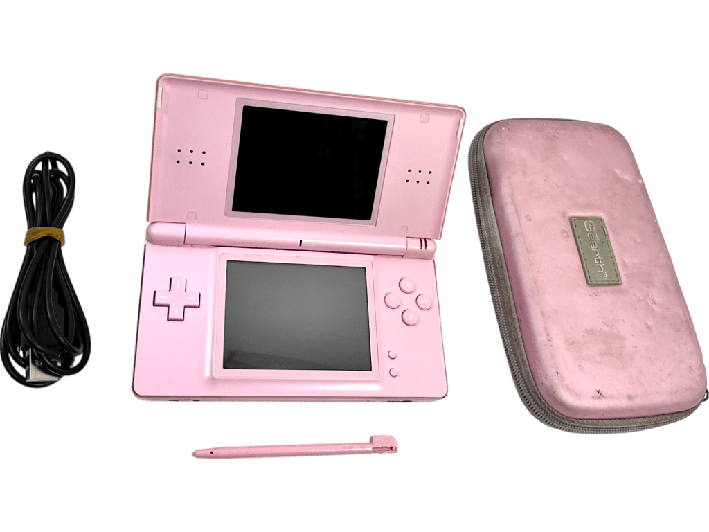 PINK Nintendo DS Lite Console + Zip Travel Case + USB Charger + Gameboy Advance Guard + Stylus Pen. This preowned Nintendo DS Lite Pink Console is in very good condition – screens and gaming interface superb. The only notable imperfection I could find was a tiny spot of black on the top screen which can be seen in Image 5. This is a spot of dead pixels and is visible when the console is turned on, but not when the console is turned off. Travel case is well used, but is still very tidy inside. A complete playing bundle. Refer images.