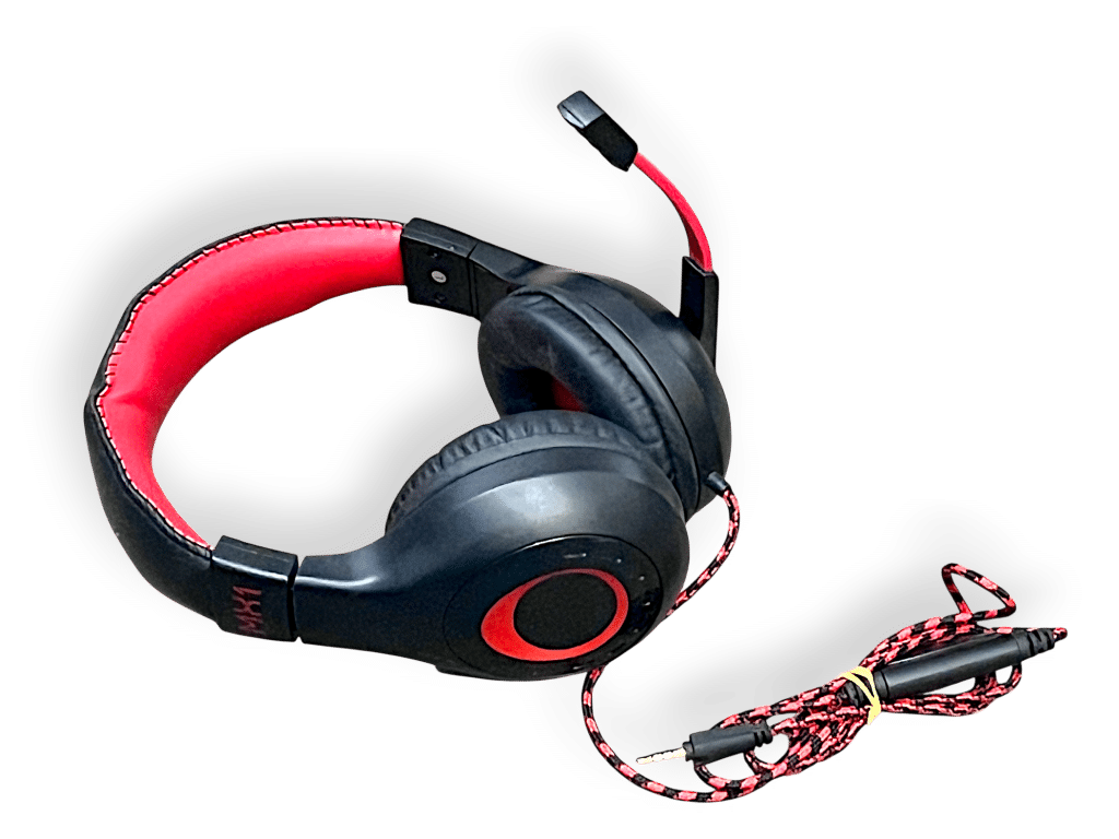 Wired gaming headset with adjustable microphone and padded ear cushions. Red and black color scheme with comfortable over-ear design. 3.5mm audio jack compatible with PC, consoles, and mobile devices. Braided cable for durability. Good working condition with clear audio output.