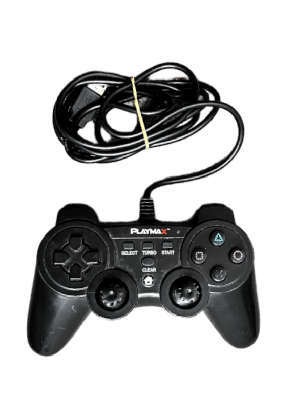 Genuine Wired PlayMax Controller for use with SONY PlayStation 3 and PC gaming. This preowned controller is in good condition and perfect working order, with worn rubber analogs as a purely cosmetic imperfection which does not hinder performance in any way.