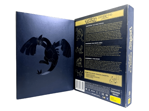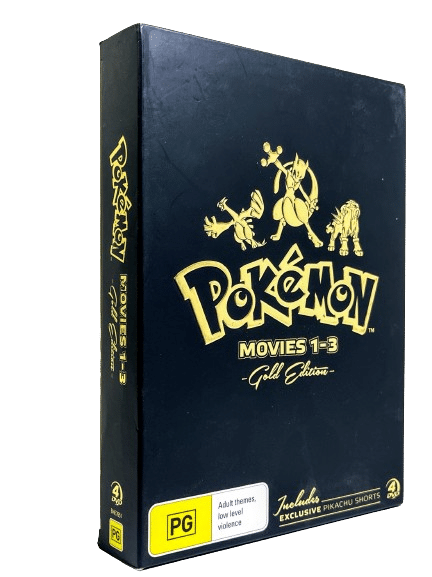 RARE & COLLECTIBLE POKEMON MOVIE BOX SET – Movies 1, 2, & 3. GOLD EDITION (Region 4) Mint in Box. Preowned but in mint condition and complete. A lovely collector’s item. Box Dimensions (mm): 140 x 190 x 30.