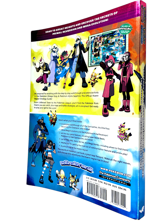Pokemon Omega Ruby & Pokemon Alpha Sapphire: The Official Hoenn Region Strategy Guide Paperback – 21 November 2014 – COMPLETE WITH PULL OUT POSTER / MAP. This preowned Official Pokemon Strategy Guide Book is in good preowned condition. Back cover has a faint crease line near the bottom. but this wasn’t immediately obvious until I was up close and looking for imperfections under reflective light. Refer photographs.