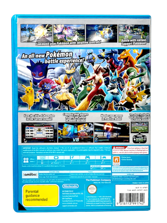 Excellent condition & 100% complete with contents: POKEMON – POKKEN TOURNAMENT DX for NINTENDO Wii U. This preowned game comes complete with case, cover, instruction card, and game disc. GENUINE NZ/AUS PRINT with the signature “PG” classification in the cover.