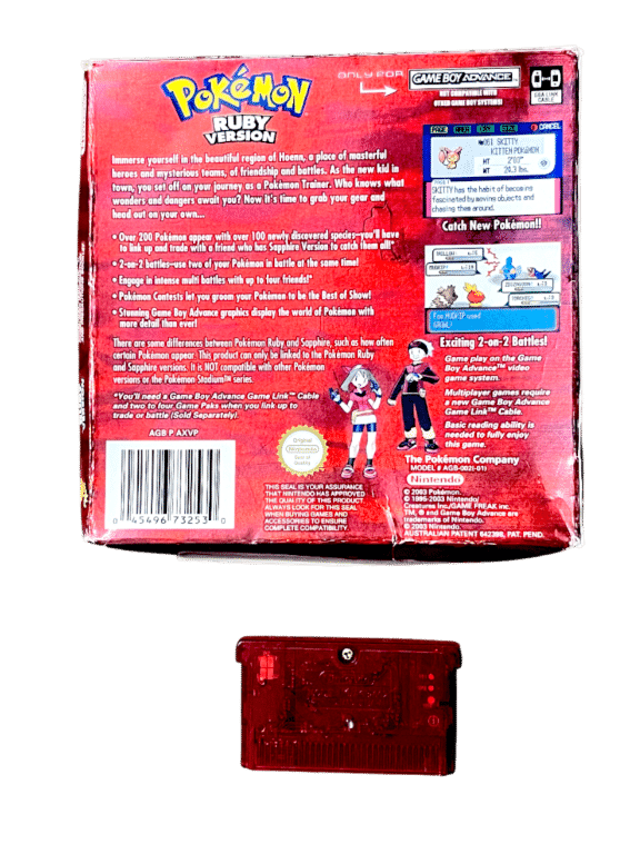 INCLUDES ORIGINAL BOX & GAME CARTRIDGE: POKEMON RUBY VERSION for NINTENDO Game Boy Advance / Gameboy Advance. This preowned authentic Nintendo GBA BOXED POKEMON GAME is in good condition as pictured. The box has some pictured cardboard wear, but this is purely cosmetic. Refer photographs.