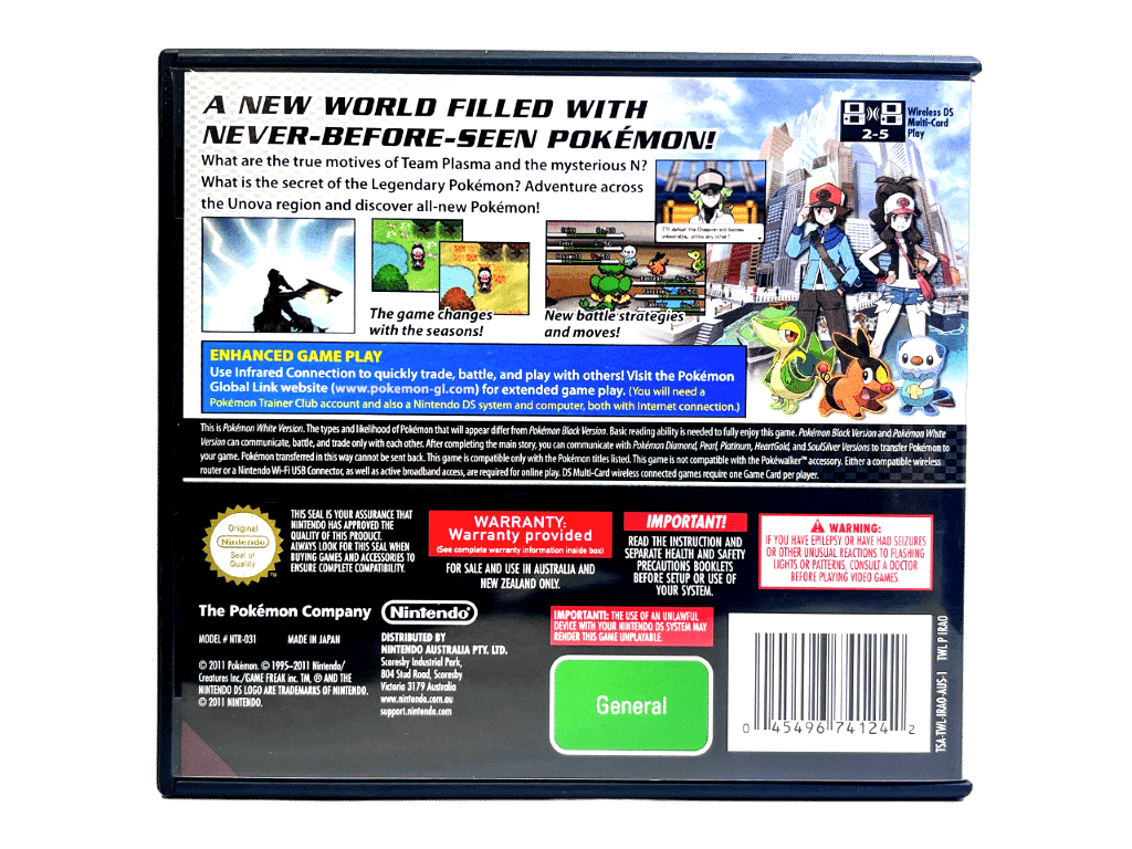 GENUINE NZ PRINT in Mint Condition & 100% Complete with ALL Contents: POKÉMON White Version / Pokemon WHITE Version for NINTENDO DS. This preowned game is in superb condition and comes complete with case + cover + inner paperwork / booklets + game cartridge. A tidy and complete collector’s item. Refer photographs.