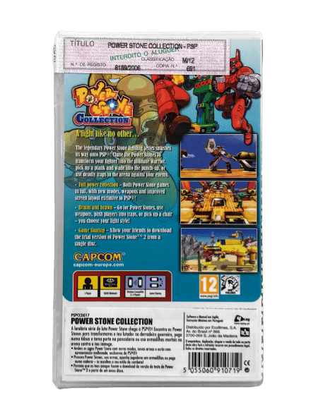 Power Stone Collection brings the great action of the Power Stone series together on one disc! Arcade mode allows a single character to put their skills to the test against a lineup of computer controlled opponents. Unlock a variety of bonus features, including weapons, characters, galleries, additional modes and more. As an added bonus, the four additional characters from Power Stone 2 have been made available for Power Stone, bringing the total to 15 playable characters! Upgraded camera system – Players get a wider view of the action, tailored for the PSP screen Toggle between wide, mid and close range views of the action at any time Unlockable bonuses including new weapons & items Ad hoc multiplayer