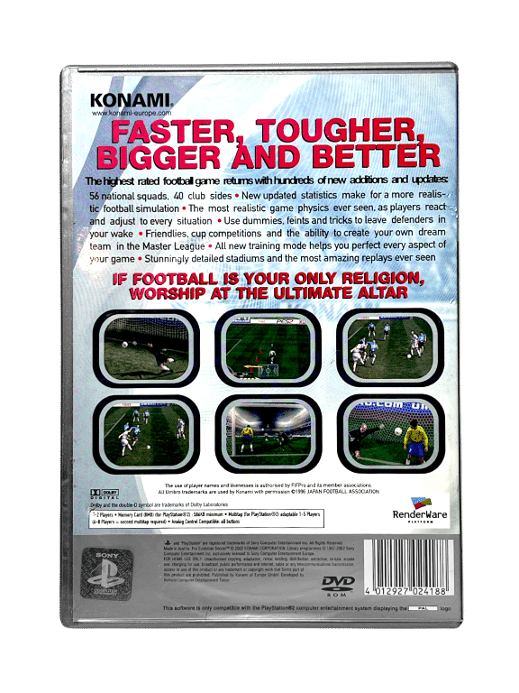 RARE PS2 FOOTBALL GAME: PRO EVOLUTION SOCCER 2 / PES 2 for SONY PlayStation 2 / PS2. This preowned game is in good condition and includes case + cover + game disc. This has light scratches, but these are purely cosmetic and do not hinder performance or gameplay in any way. Please note that the MANUAL IS NOT INCLUDED in this listing, but the game is self-explanatory, and the instructions are readily available online.
