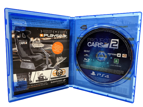 PROJECT CARS 2 / Project Cars II for SONY PlayStation 4 / PS4. This preowned game includes case, cover, Project Cars 2 carded insert, and game disc. The paper cover has a small paper tear in the top righthand corner, but this is a very minor imperfection, and the game disc inside is superb.