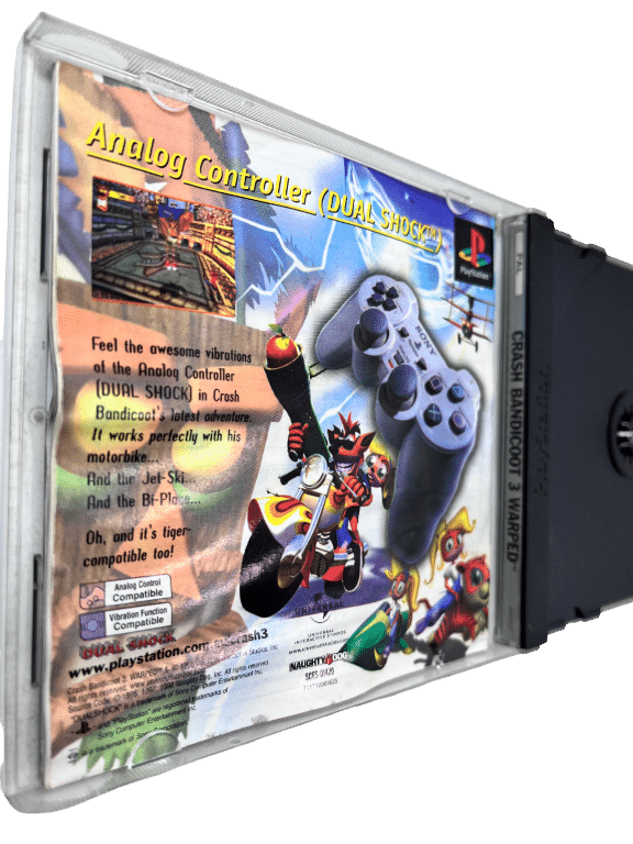 CRASH BANDICOOT 3 WARPED SONY PlayStation (PS1) game. This preowned game includes case + reverse cover + manual / booklet + original print game disc. Booklet pages are stuck together. Front cover slip not included. Disc has some minor markings and superficial scratches, but these are purely cosmetic and do not hinder performance or game play in any way.