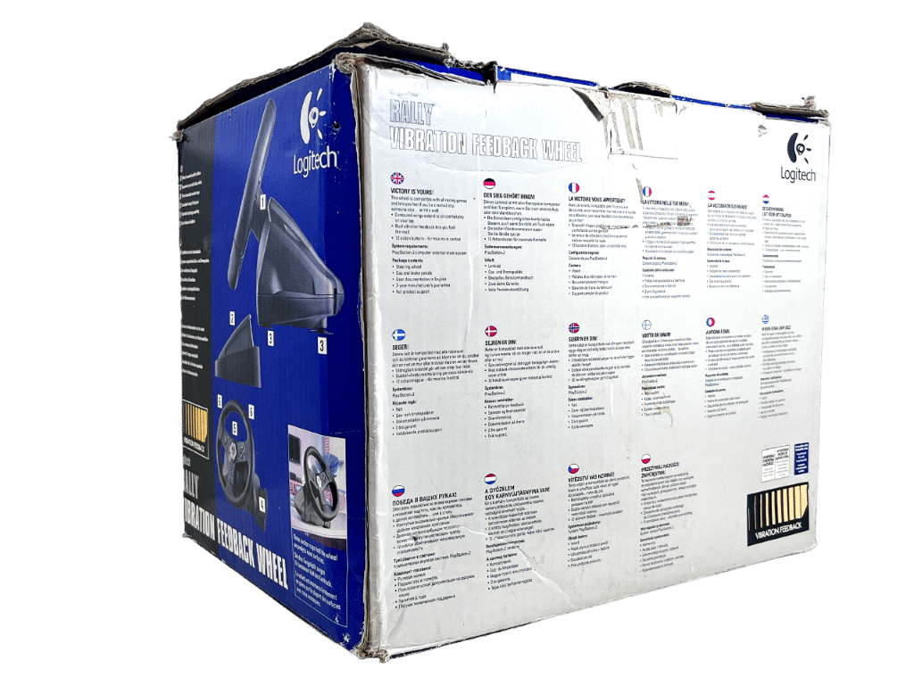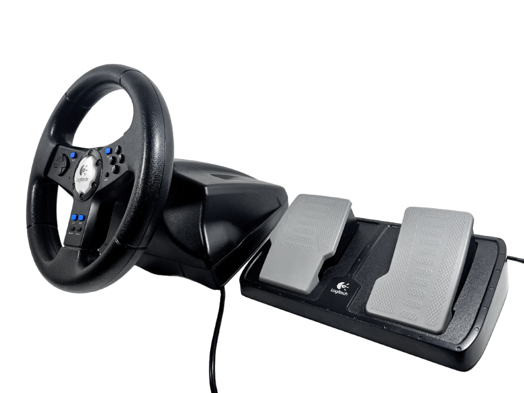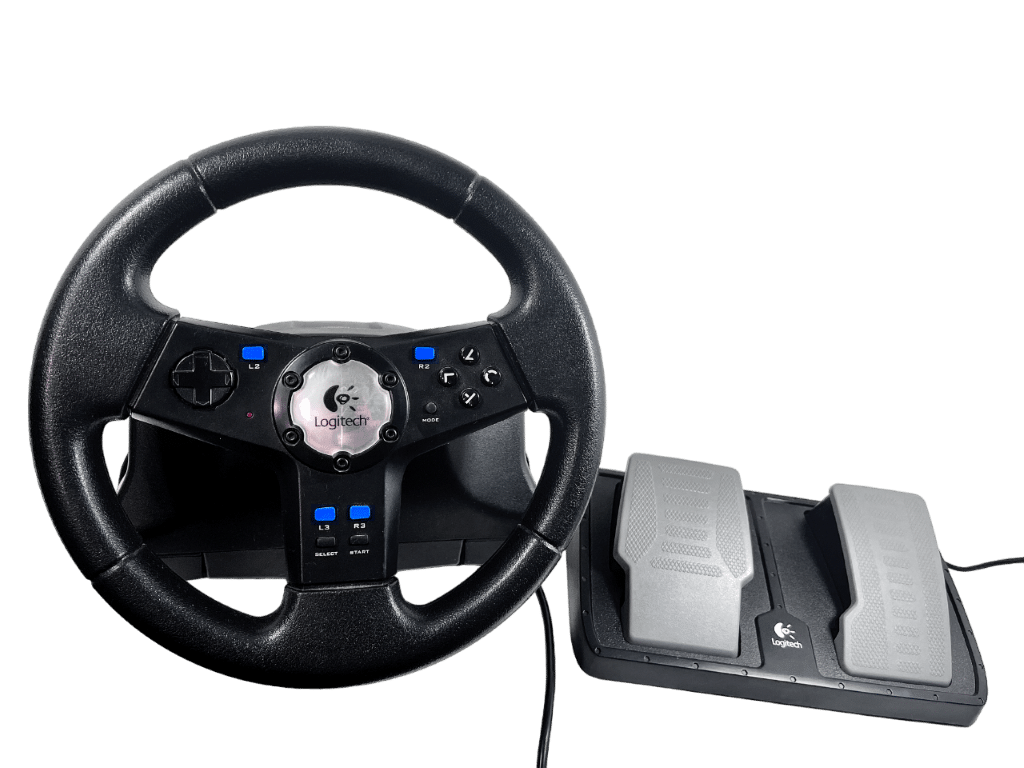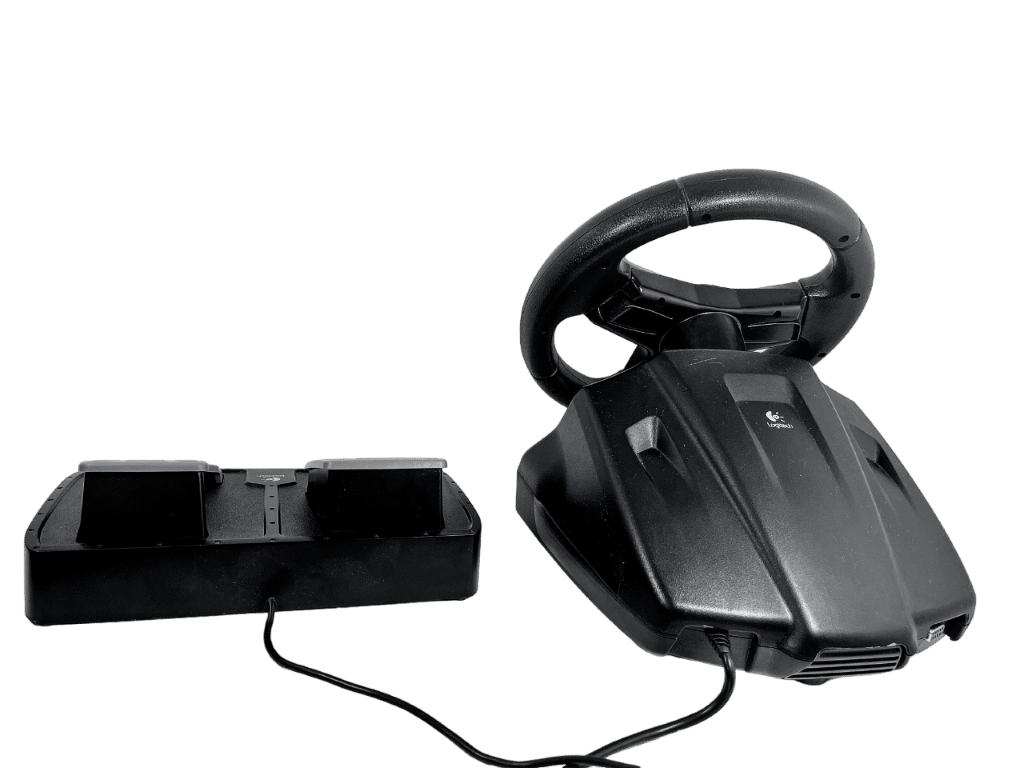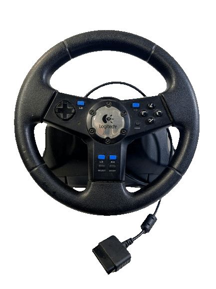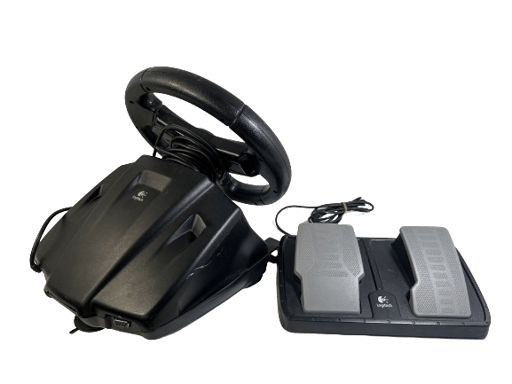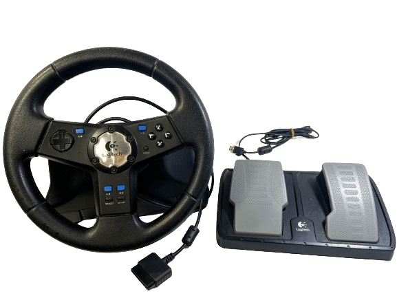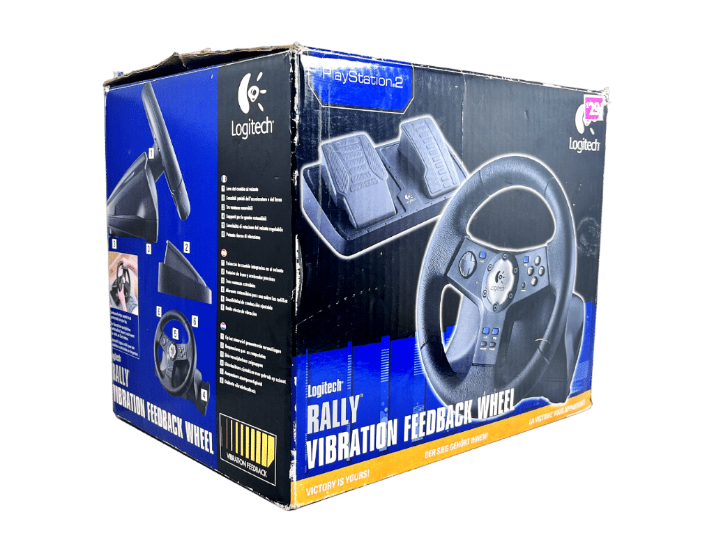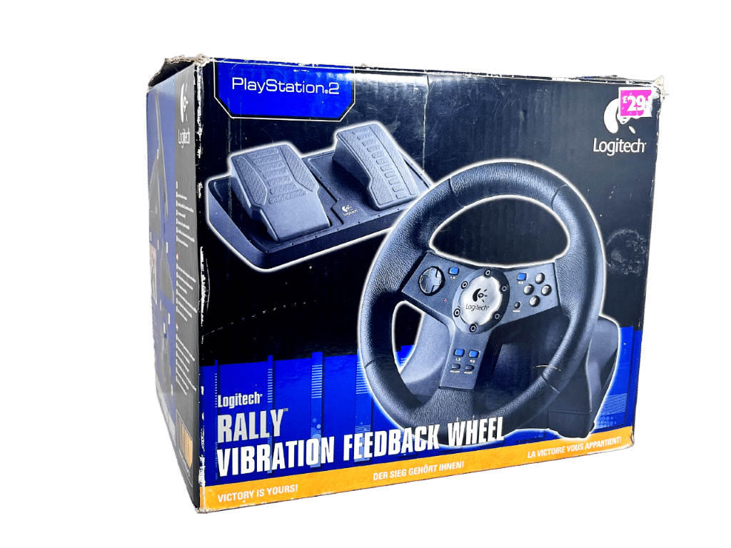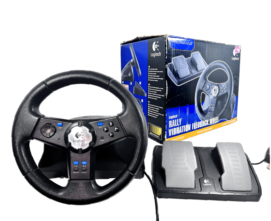 PS2 Logitech NASCAR Racing Wheel – With Pedals (Model E-X2A12) – Wheel + Pedals Racing Setup (compatible with SONY PlayStation 2. This preowned Racing Setup is in good condition and perfect order, with cosmetic markings and superficial imperfections only which do not hinder functionality or game play in any way. INCLUDES ORIGINAL BOX. Box has some cardboard wear on the lid. Structurally very good.