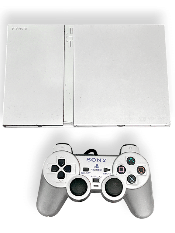 Limited Edition SILVER Slim SONY PlayStation 2 with matching Official Silver Sony PS2 Controller. This preowned Genuine Sony PlayStation 2 Set is in good condition and perfect working order, and includes official SONY Power Adapter, Detachable Power Lead, and SONY AVI Leads to connect to your TV. This console and controller have light cosmetic imperfections (surface markings and fine scratches), and I spotted one tiny piece of plastic missing off the front , but these are superficial imperfections only which do not affect functionality in any way.