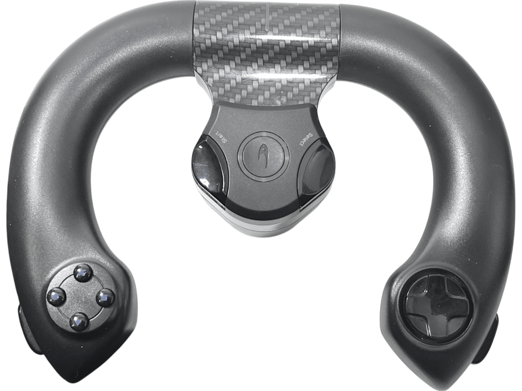 Using a built-in accelerometer, the FR-1 employs motion control to replicate the experience of driving with a traditional, mounted racing wheel. The controller itself, which bears a passing resemblance to the Cylon Raiders from Ron Moore’s Battlestar Galactica, features attractive “Carbon Fibre styling,” and is solidly constructed. The fit and finish of its black plastic components is excellent all around. The FR-1 feels strong and substantial in the hand, but remains mercifully light – an important consideration for players who will be holding the unit in front of themselves for extended gaming sessions.