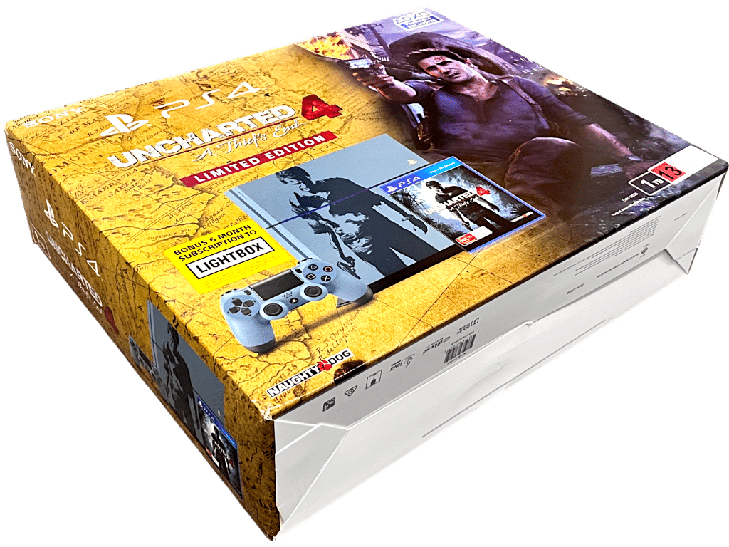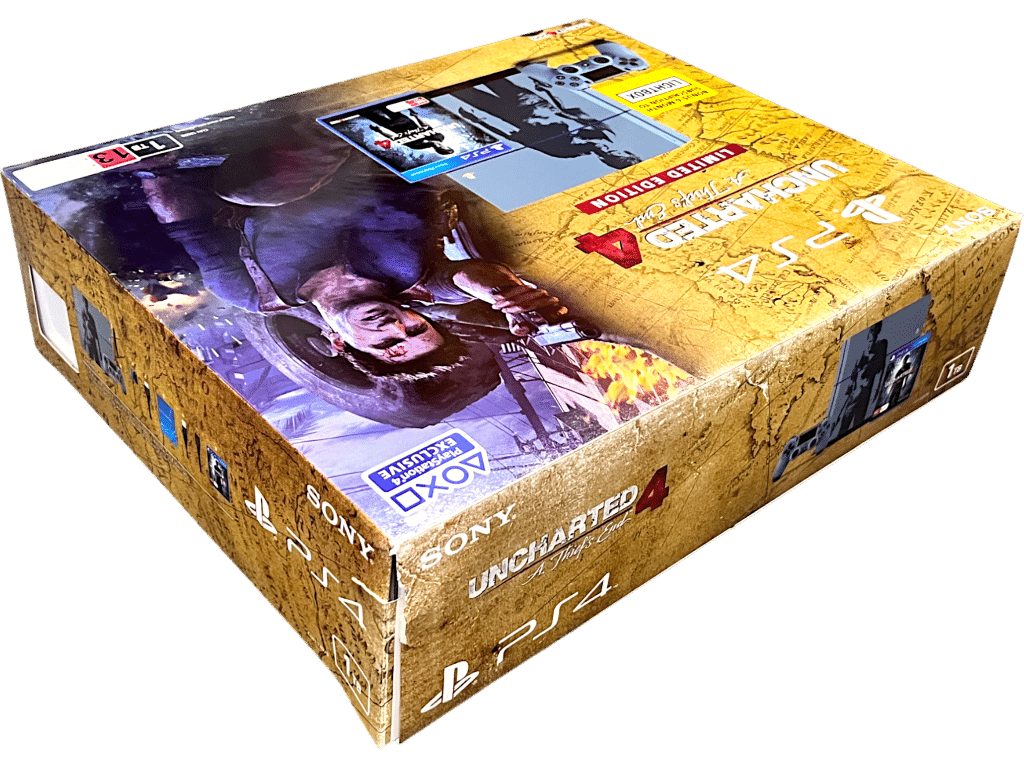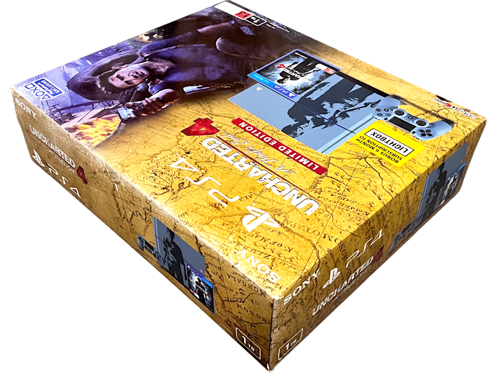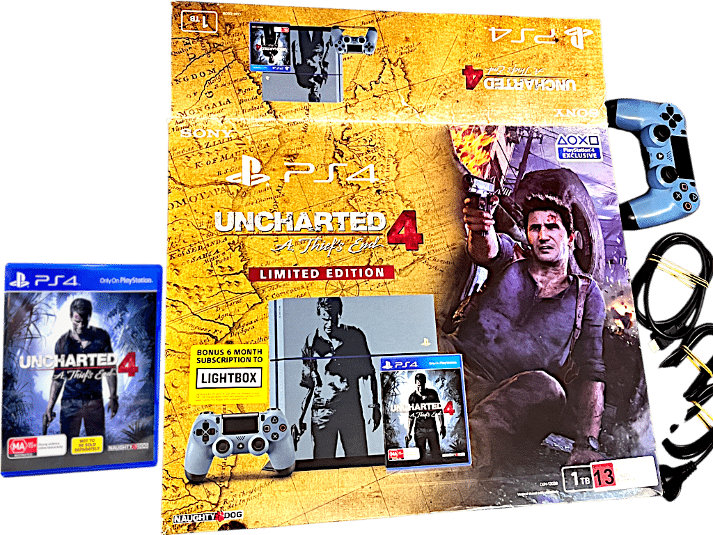 RARE FIND – Excellent Condition & complete with matching Uncharted 4 PS4 controller + original box + cardboard mounts + Limited Edition Uncharted 4 PS4 game: Official UNCHARTED 4 Limited Edition SONY PS4 1 TERABYTE (1TB) Console + Matching Uncharted 4 Limited Edition Wireless PS4 Controller. This preowned authentic Limited Collector’s Console is in Excellent Condition – well cared for since new. Console includes its original matching Uncharted 4 Limited Edition PlayStation 4 Wireless Dualshock 4 Controller, Uncharted 4 Limited Edition game (with the signature “not to be sold separately” embedded in the cover art both front and back), HDMI Lead, Power Lead, and Micro USB Charging Lead; even the original bundled stereo headphones are included! Box excellent and includes both inner storage white box + outer display box. Outer display box has one small card tear on one corner pictured at the point of opening, but this is subtle and purely cosmetic. A lovely matching set – suitable as a gift. Refer photographs.