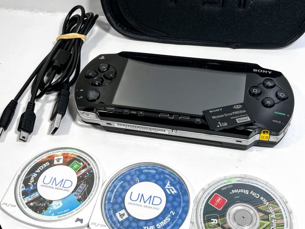 LARGE PLAYING BUNDLE: SONY PSP 1000 Series Console in perfect working order + PSP Charger + Padded PSP Case + Genuine SONY 1GB Memory Card + 3 x Games. This preowned authentic Series 1000 PSP Console has light cosmetic imperfections consistent with use, but which do not hinder this PlayStation Portable’s (PSP’s) perfect performance in any way. The included USB PSP charger and PSP soft protective case are both New. The Official SONY PSP Memory Card is in excellent condition, as are the miniature game discs. The UMD plastic cases have some plastic wear and tear, but this is cosmetic only and does not hinder their performance in any way. Games included: Grand Theft Auto Vice City Stories + The SIMS 2 + Sega Rally.