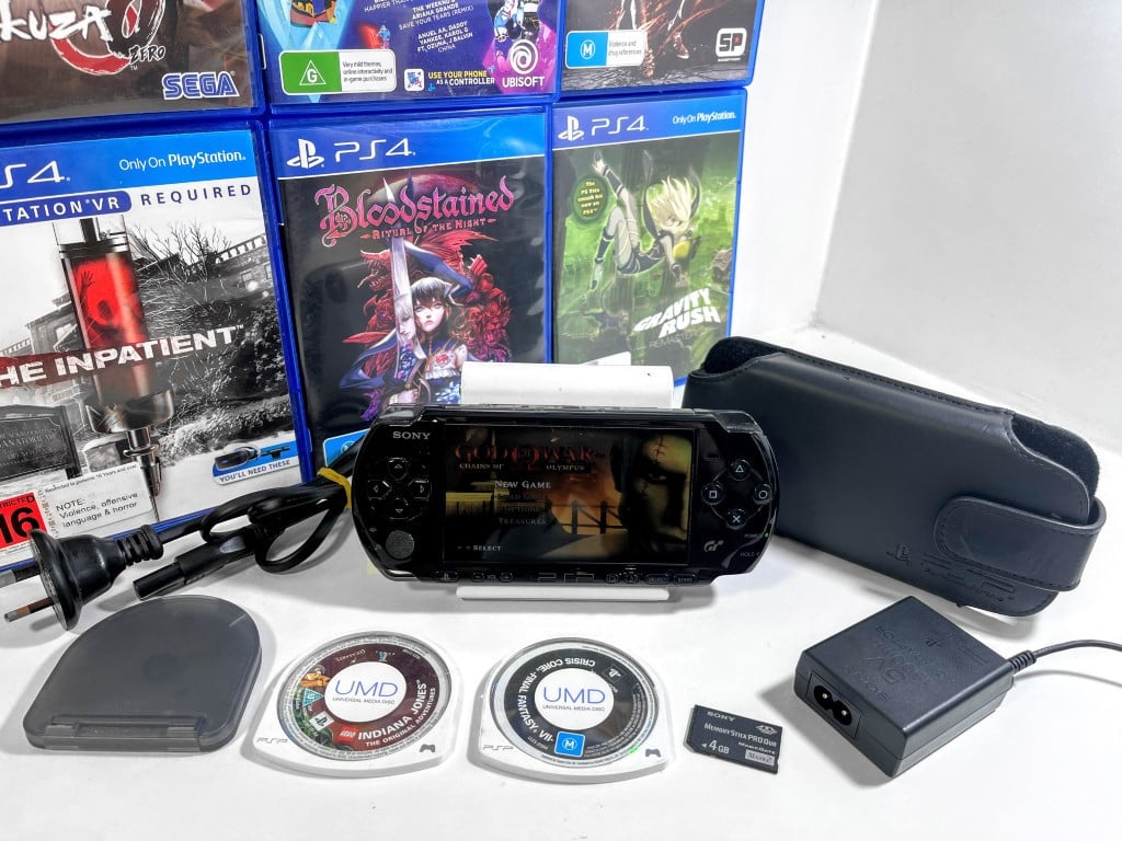 Excellent Condition: SONY PSP Slim 3002 / PlayStation Portable Slim 3002 console + Genuine SONY charger + Quality PSP Leather-Look PSP Case + Genuine Sony 4GB PSP memory card + Genuine SONY PSP AC Wall Charger + power lead + popular games. This is the final revision of the popular PSP line of gaming consoles and still the most popular model, with a compliment of upgrades on its predecessors. This preowned PSP Slim 3000 Series Console is in excellent condition – the tidiest of its kind that we have seen in a long time, with only very mild superficial markings. This PSP includes a genuine SONY PSP Wall Charger with Detachable Power Lead + Quality PSP Snaplock Travel Case + LARGE 4GB PSP Memory Card (Memory Stick Pro Duo card) + PSP game plastic protector case + 2 x Popular PSP games: Crisis Core Final Fantasy VII & Lego Indiana Jones 2 The Adventure Continues.