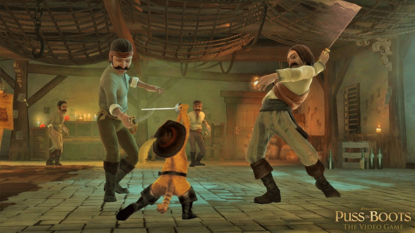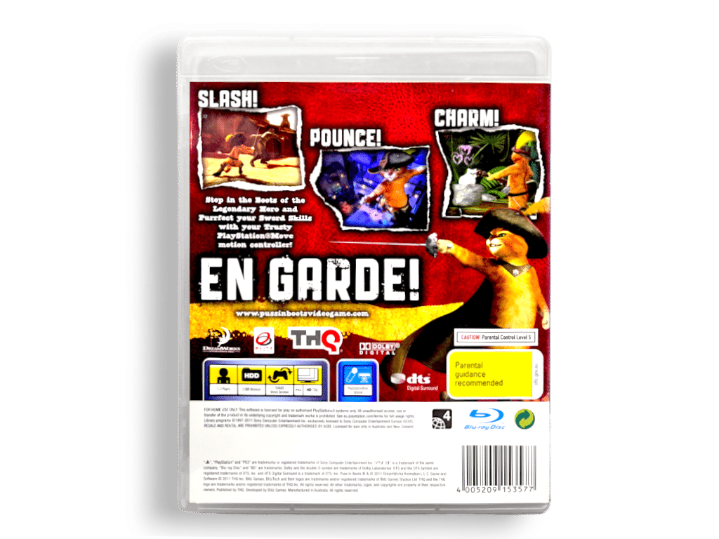 Step into the boots of Puss In Boots, star of the upcoming film from DreamWorks Animation, and use your sword fighting moves and sly skills to become the legendary hero! Master the style and charm of Puss in Boots in an engaging swashbuckling experience. Duel banditos with style and flair, use cat-like sneaking skills to fool your foes, and team with characters from the film to catch the Golden Goose plus, strum your guitar to serenade the seoritas along the way! Its the adventure of nine lifetimes