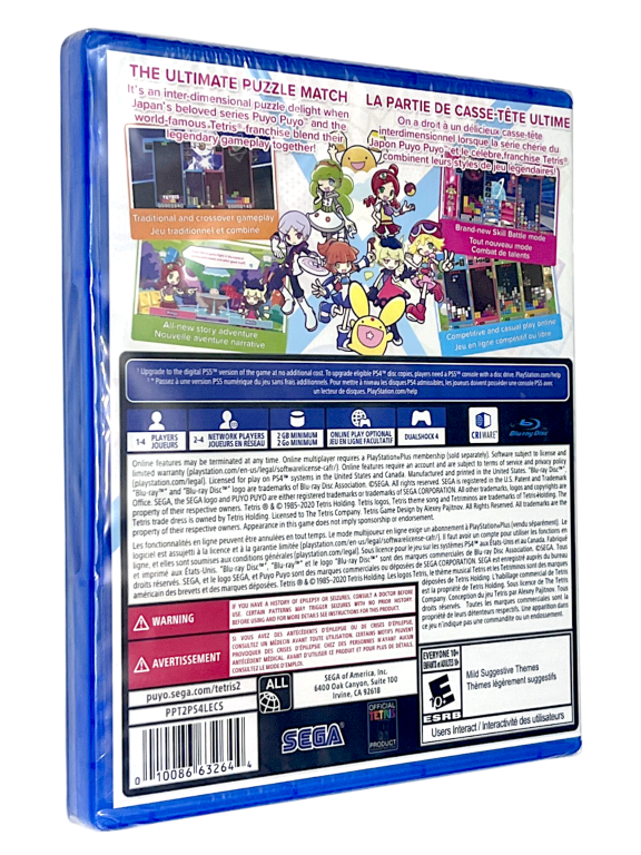 Puyo Puyo Tetris 2 (PS4) NEW SEALED – Puyo Puyo Tetris 2 brings together two legendary puzzle game franchises in a colourful and fast-paced crossover packed with competitive and cooperative modes. Players can enjoy classic Puyo Puyo chain reactions, traditional Tetris line clearing, or unique hybrid modes that blend both styles into frantic puzzle battles. With a large roster of characters, an expanded story mode, and local or online multiplayer, it delivers addictive puzzle gameplay for both casual and competitive players.