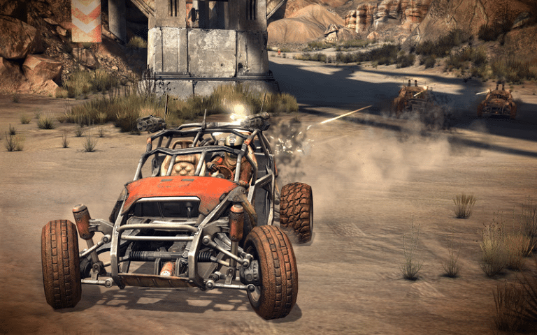 - Frenetic 3rd-person vehicular mayhem – Burn rubber across the wasteland in your very own super buggy! Upgrade and customize your car with special parts, paint jobs and weapons, then test your skills as you battle four-wheeling bandit clans and participate in deadly races.