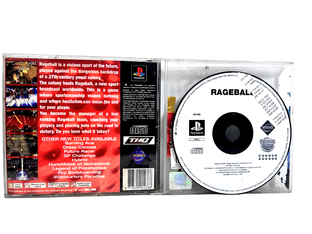 RAGEBALL / RAGE BALL for SONY PlayStation 1 / PS1. This preowned game disc is in excellent condition and includes case + back cover slip (does not include front cover slip or manual). Front plastic panel of the case has one missing tab, but still closes securely