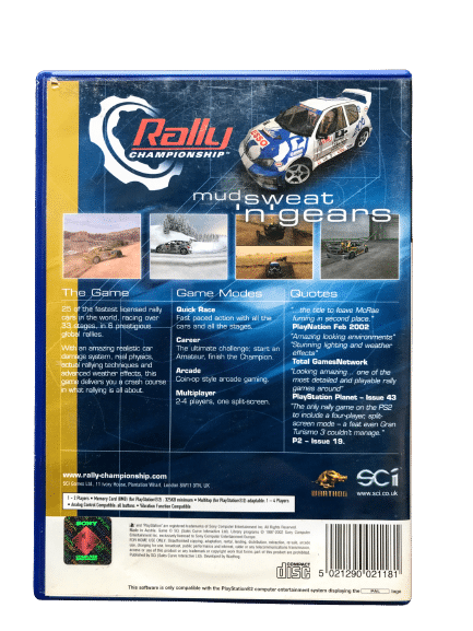 RARE & Collectible Driving & Racing Game in Excellent Condition & 100% complete with Contents: RALLY CHAMPIONSHIP (NOT to be confused with the similarly titled WRC World Rally Championship) for SONY PlayStation 2 / PS2. This preowned game is in superb condition, and comes complete with case, cover, manual / booklet, and game disc. Case has some mild laminate plastic wear from shelf life, but this is purely cosmetic, and each of the internal contents are superb. Overall, a tidy and complete collector’s item.