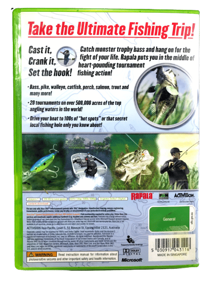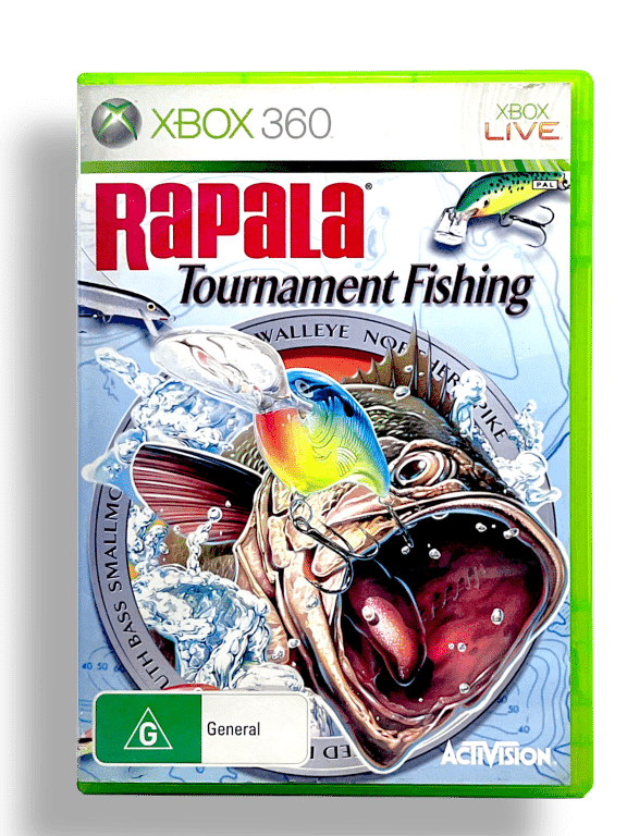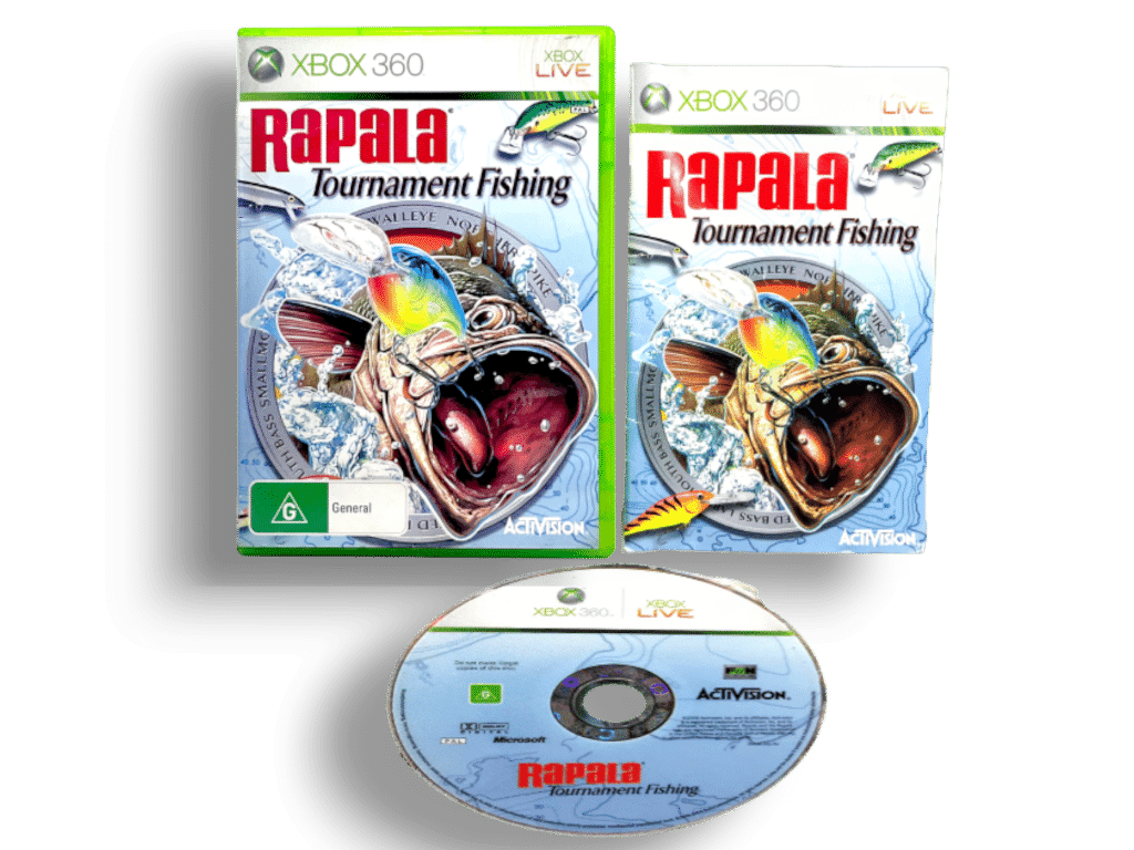 RAPALA TOURNAMENT FISHING for Xbox 360. This preowned game is in good condition and includes case + cover + game disc. Please note that the MANUAL IS NOT INCLUDED in this listing, but the game is self-explanatory, and the instructions are readily available online.