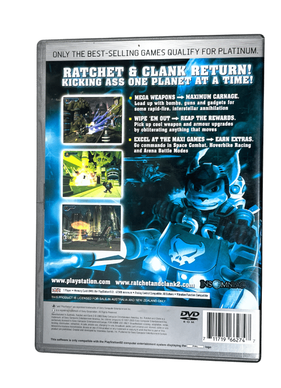 Excellent condition & 100% complete with contents: RATCHET and CLANK 2 LOCKED & LOADED for SONY PlayStation 2 / PS2. This preowned game is in superb condition and comes complete with case, cover, manual / booklet and game disc. When I inspected the tiny plastic centre ring guard up closely, I spotted a microscopic plastic crack in the ring guard, but this is purely cosmetic, and the disc surface itself is pristine.